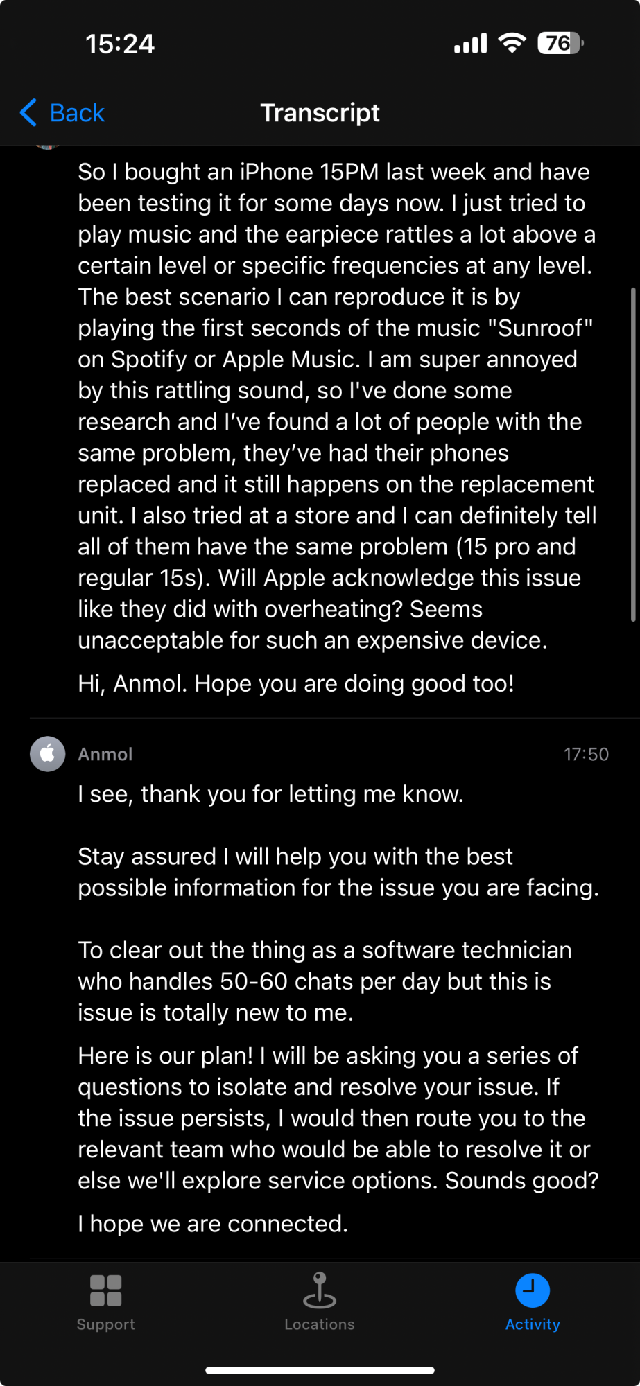 Received my new 15 PM on the 22nd. Been happy with it ever since. Does everyone experience speaker crackling issue on high volume? The speaker crackling issue happens when 1) On high volume watching video or listening to music 2) On regular phone calls (high volume on speaker) . However, even on high volume, crackling doesn't happen all the time. I'd say, on regular phone calls with speaker on, crackling noise happen more often, and the crackling noise only happen on the top earpiece speaker.