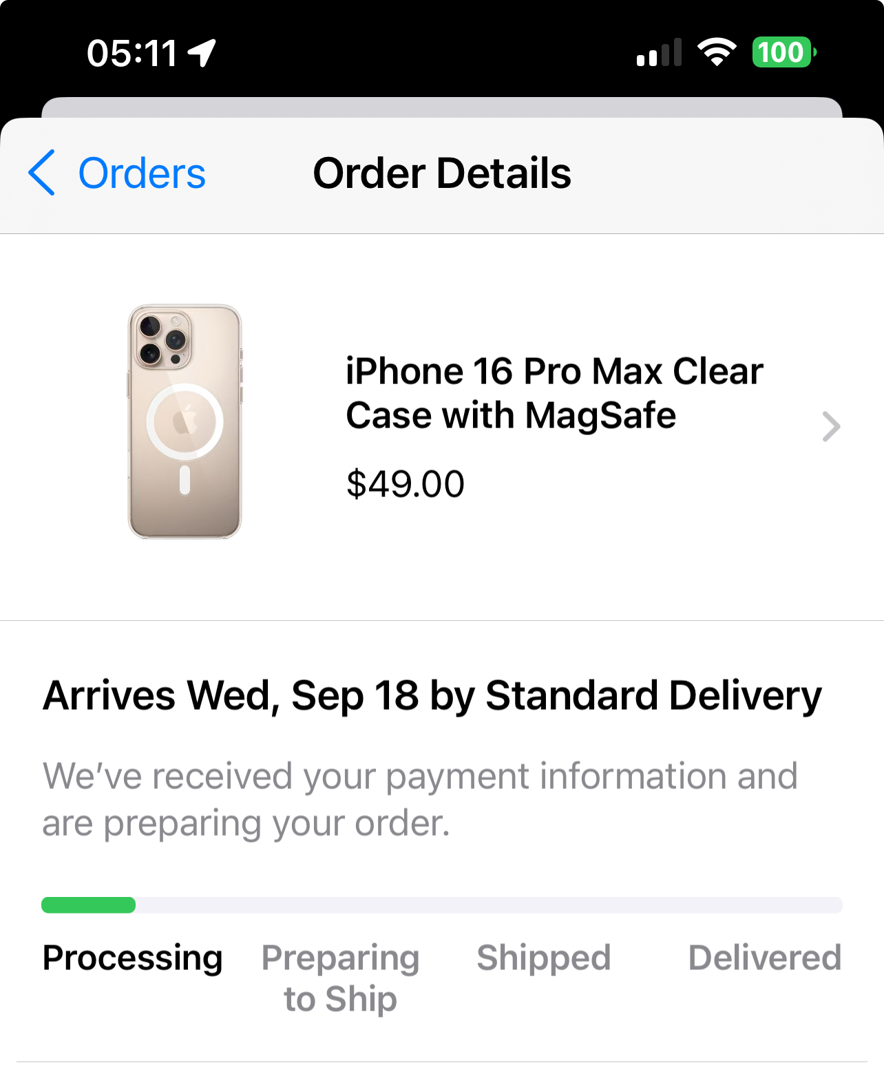 Ordered two iPhone Pro Max and both say standard delivery Wednesday 18th for the case 😝