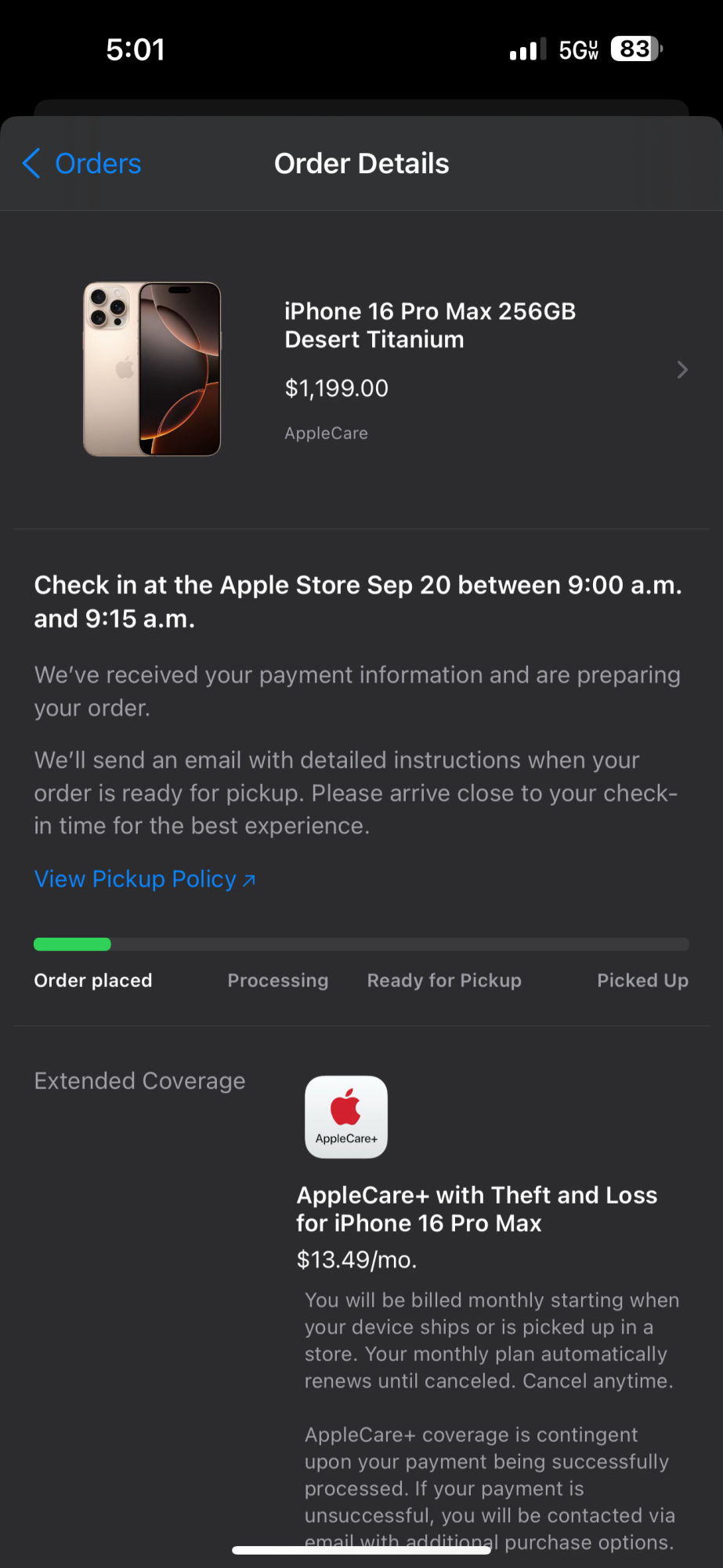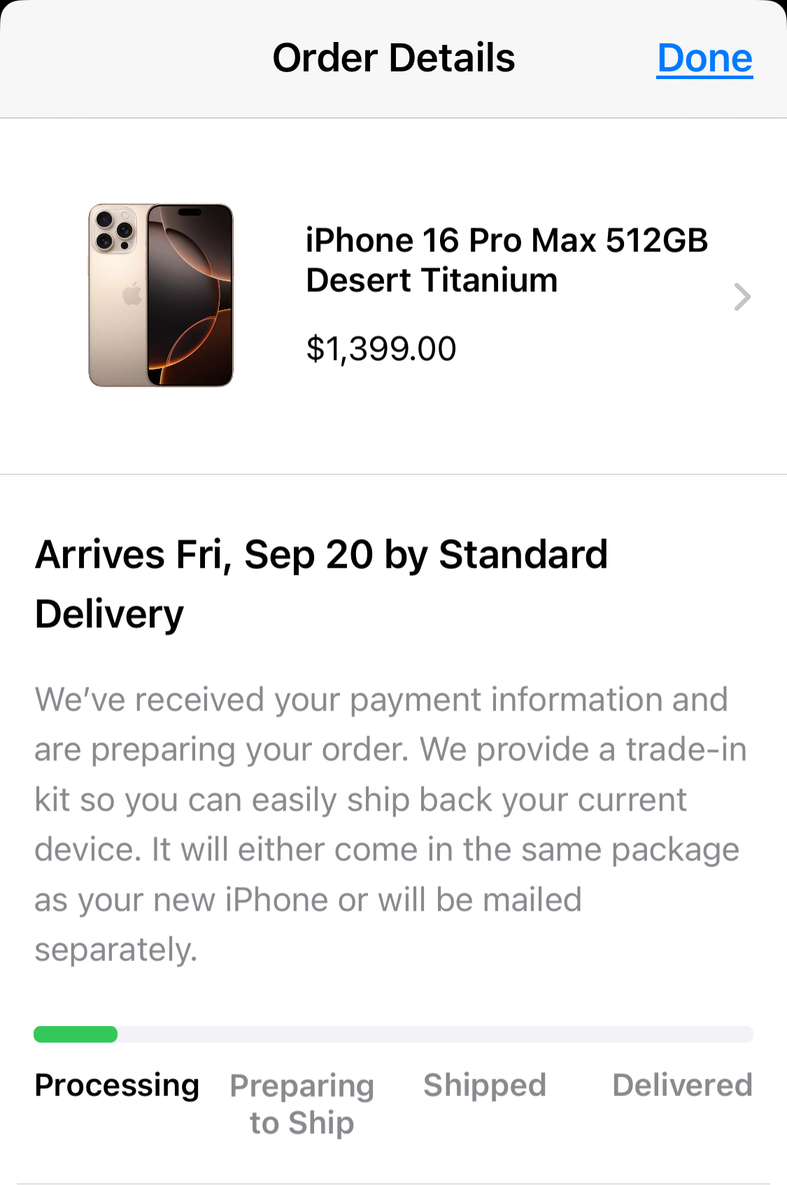 Whoa. Order complete. Desert Titanium iPhone 16 Pro Max 512GB. The landing page said wait and I'm like oh hell no refreshed it and was pre-order ready. Yea, Woot !!!!
