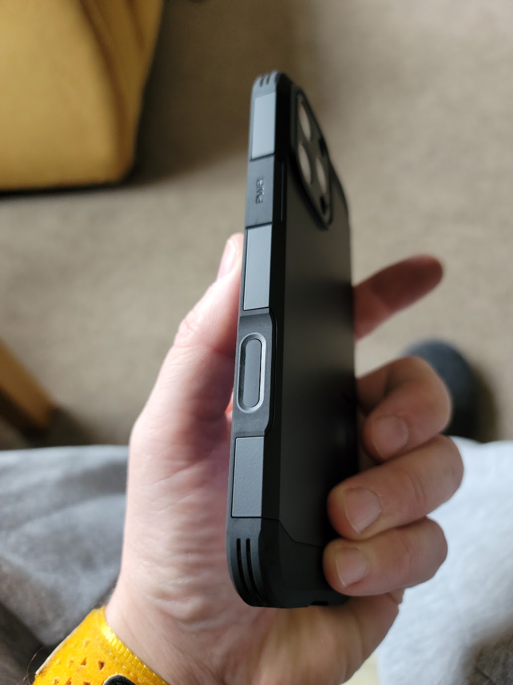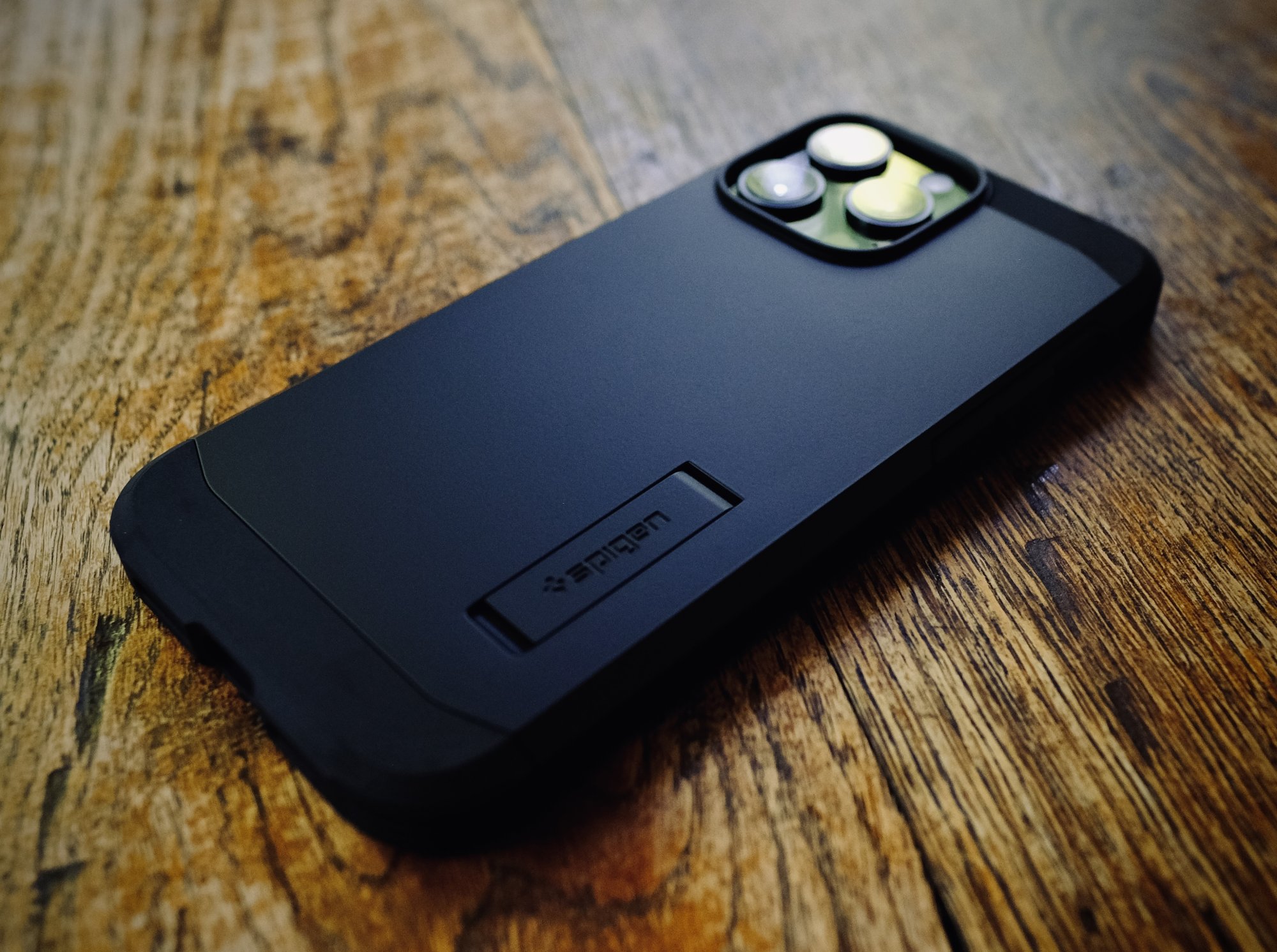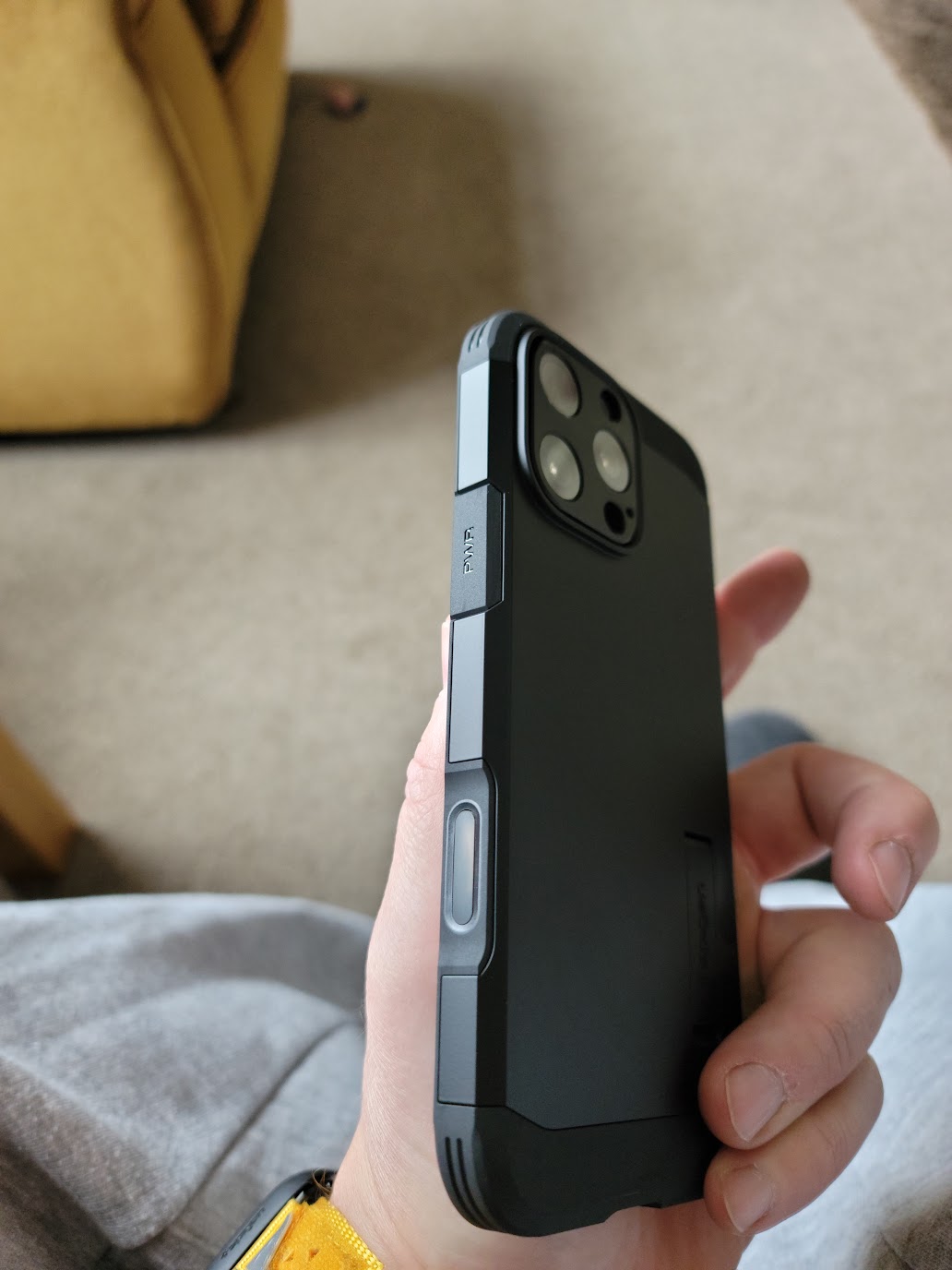 Here’s the Benks ArmorAir Aurora, another ultra-thin case that’s very similar to the Pitaka Tactile Woven. This one weighs 29 grams, while the Pitaka weighs 24 grams. Though it’s subjective, I find the Pitaka slightly more refined: the corners are a bit smoother (the Benks has slight wrinkles), and the finish on the camera ring and the interior is cleaner. The Benks has the advantage of subtly raised corners for laying the phone face down, while the Pitaka has zero lip. However, I’m not a fan of the black metal camera ring, which—if it’s like every other black metal ring I’ve had—will likely wear down and expose the metal underneath fairly quickly. The Benks is certainly the better deal, and both cases are equally nice overall, but if I had to choose, I’d probably go with the Pitaka.