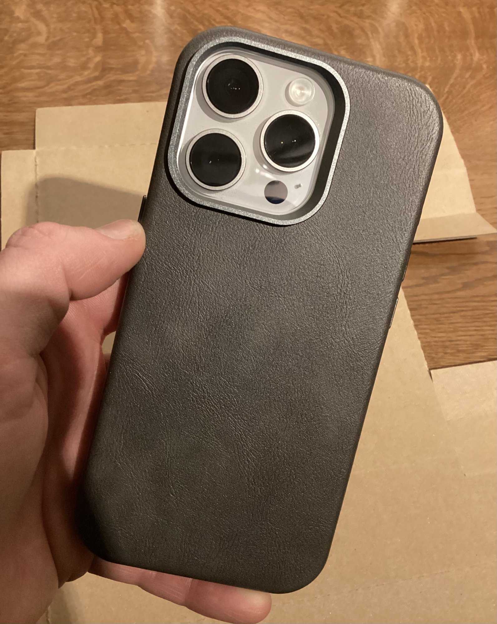 I just found this on AliExpress: £6.63 | High-end Retro Oil Wax Pattern Strong Magnetic For Magsafe Leather Case For iPhone 15 14 Plus 13 16 Pro Max Camera Button Cover