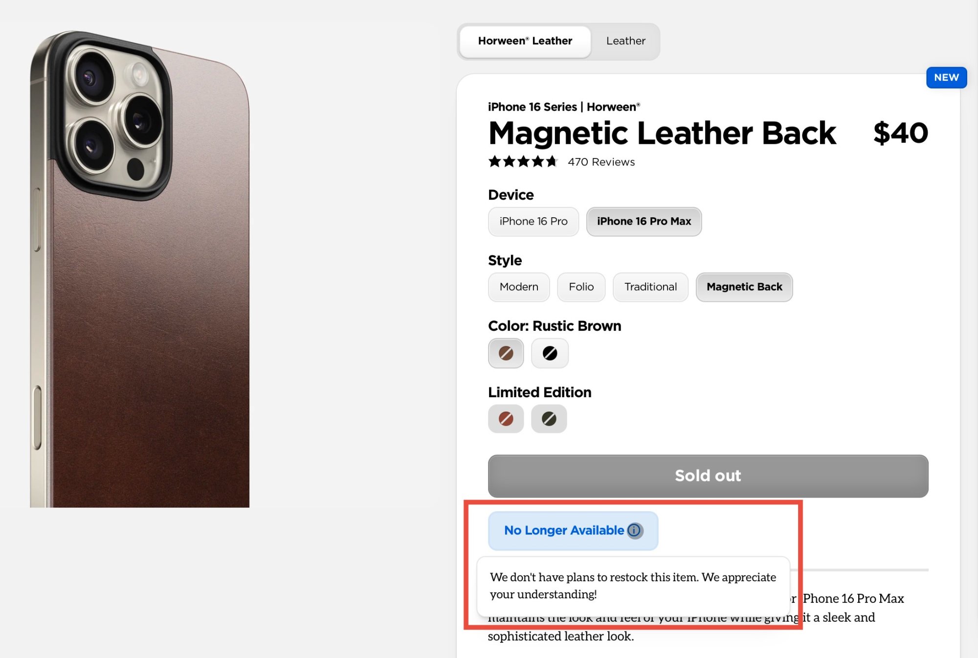 Speaking of Nomad, it looks as if they’re already discontinuing their leather phone backs. It’s kind of funny that it says “New” and “No longer available” on the same page. 😆