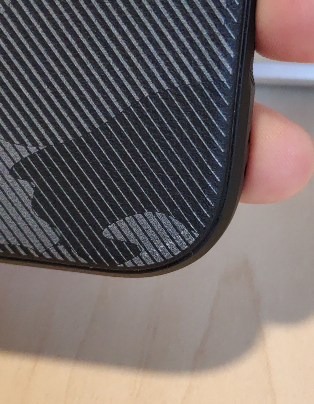 Same happened with mine 🙄Just put the Onyx Camo back on and noticed I have a scratch on the lower backI'm guessing the plain black will hold up better as I believe the camo finish is just sprayed on over the plain black case. Still not bad after 30 plus days of daily use.