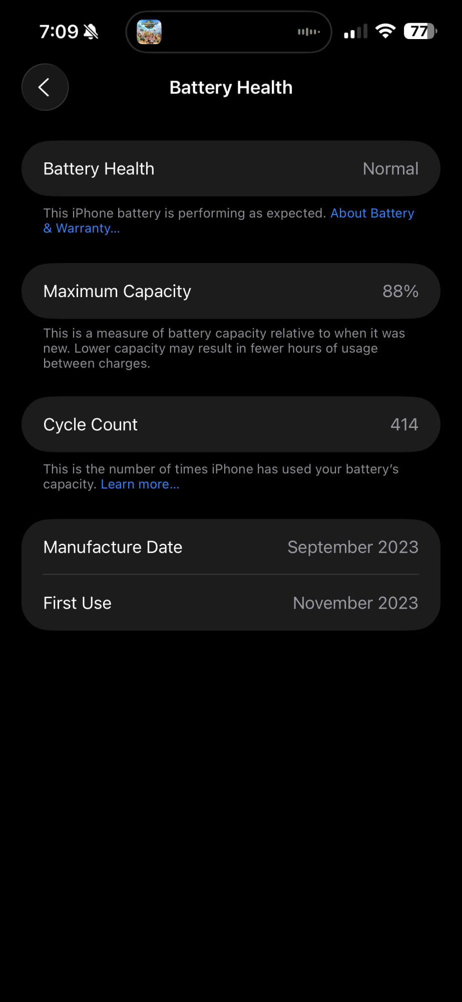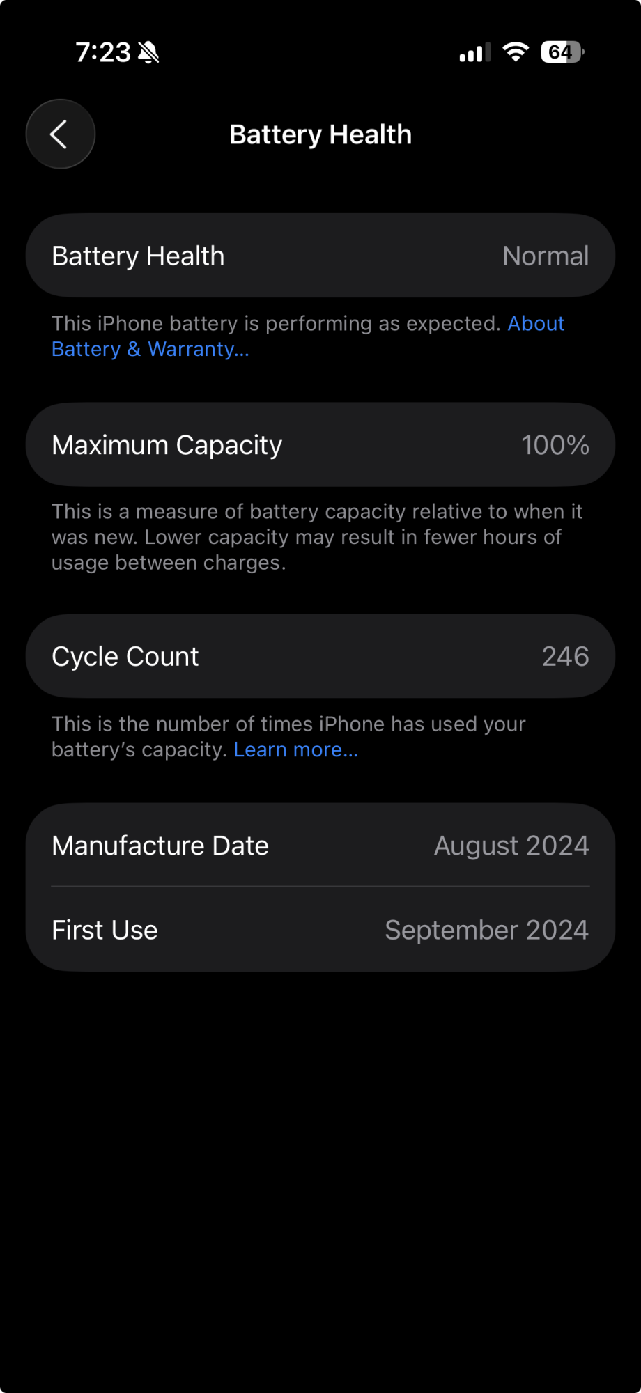 I use my older iPhones for software tests, so my iPhone 15 Pro Max is still around. At the two year mark, its capacity is 88 percent, down from 94 percent in September 2024. It has 352 cycles, and I've kept it at the 80 percent limit.