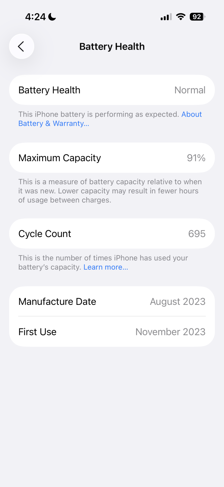 Interesting. my 13Pro is at 87% and it is almost always between 30% and 89%. it must have about 1700 cycles it is almost 5 years oldmy 13pm that I got in may ‘22 is at 85% & I leave it charging over night every night.