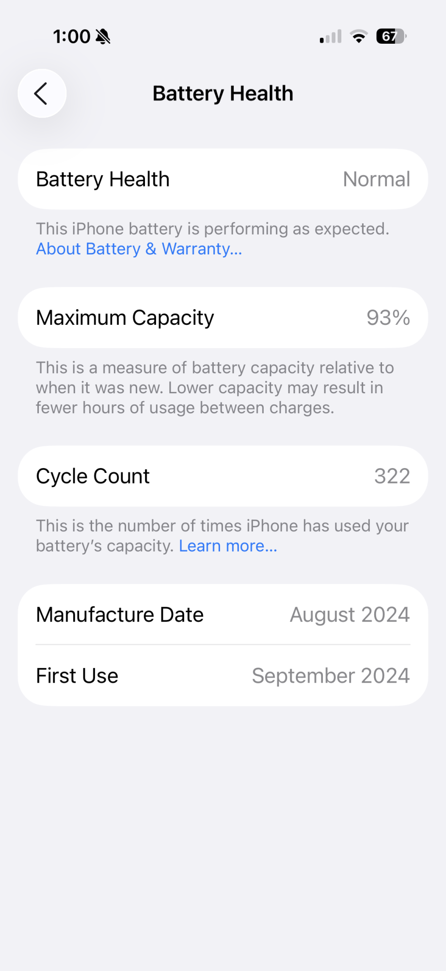 Since September 2024, my iPhone 16 Pro Max has been limited to an 80 percent charge, with no cheating. As of today, my battery's maximum capacity is at 94 percent with 299 charge cycles.