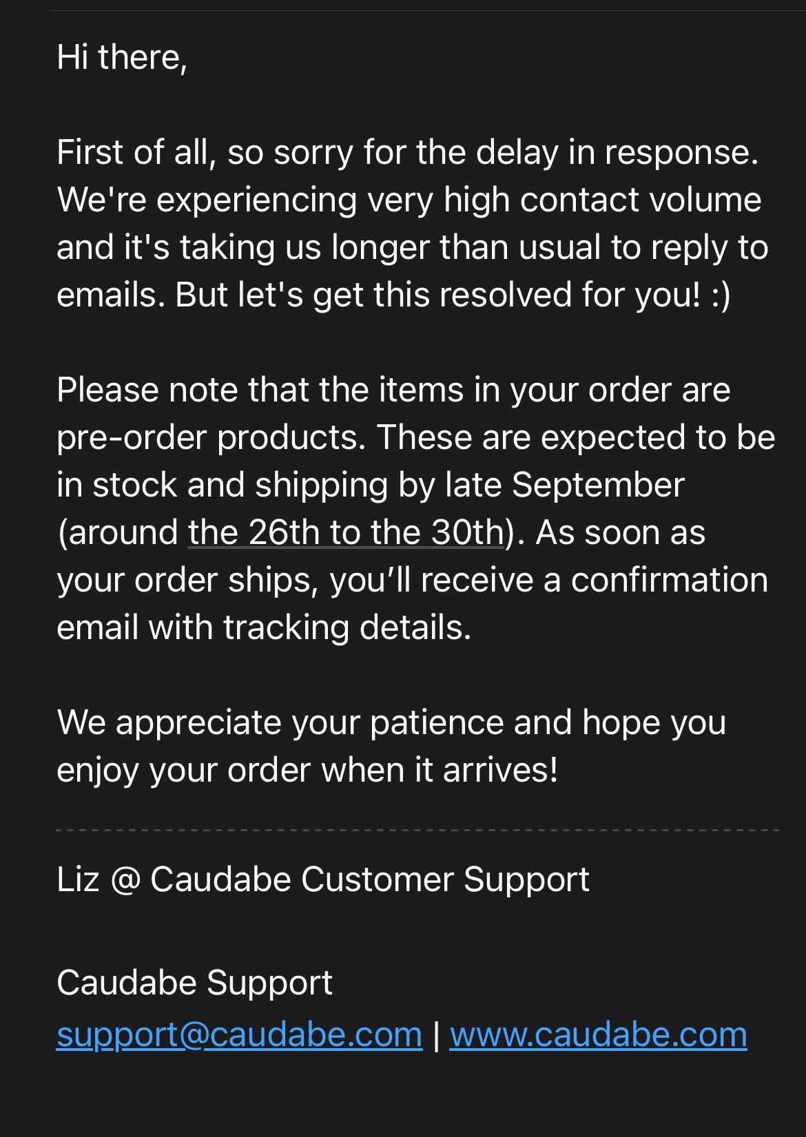 Basically waiting on their shipment to arrive from China before sending out email confirms. Tomorrow is the 26th, and Caudabe said on Reddit they’re planning to ship out the first wave of orders, so hoping I see a confirm email regarding mine 🤞