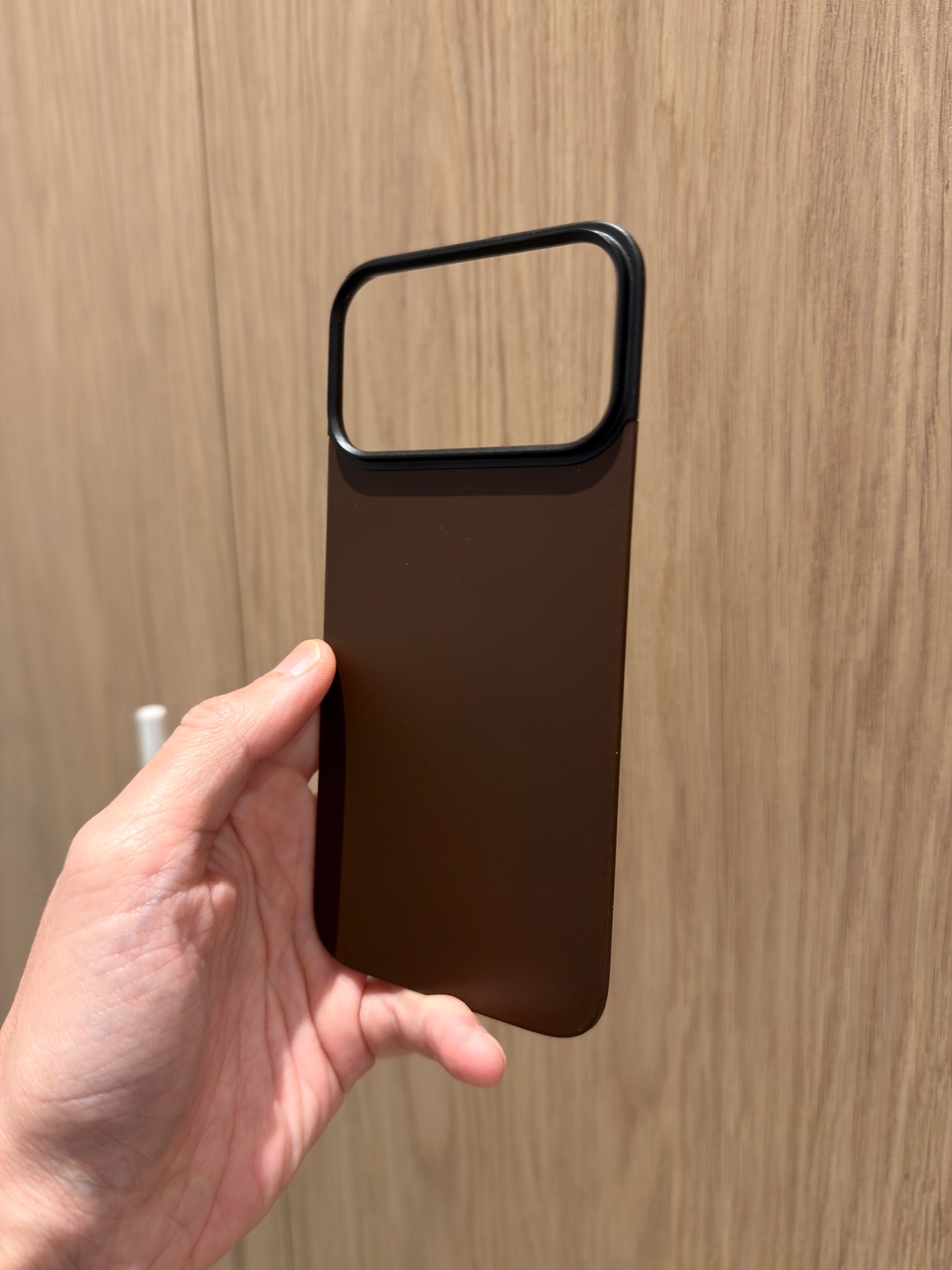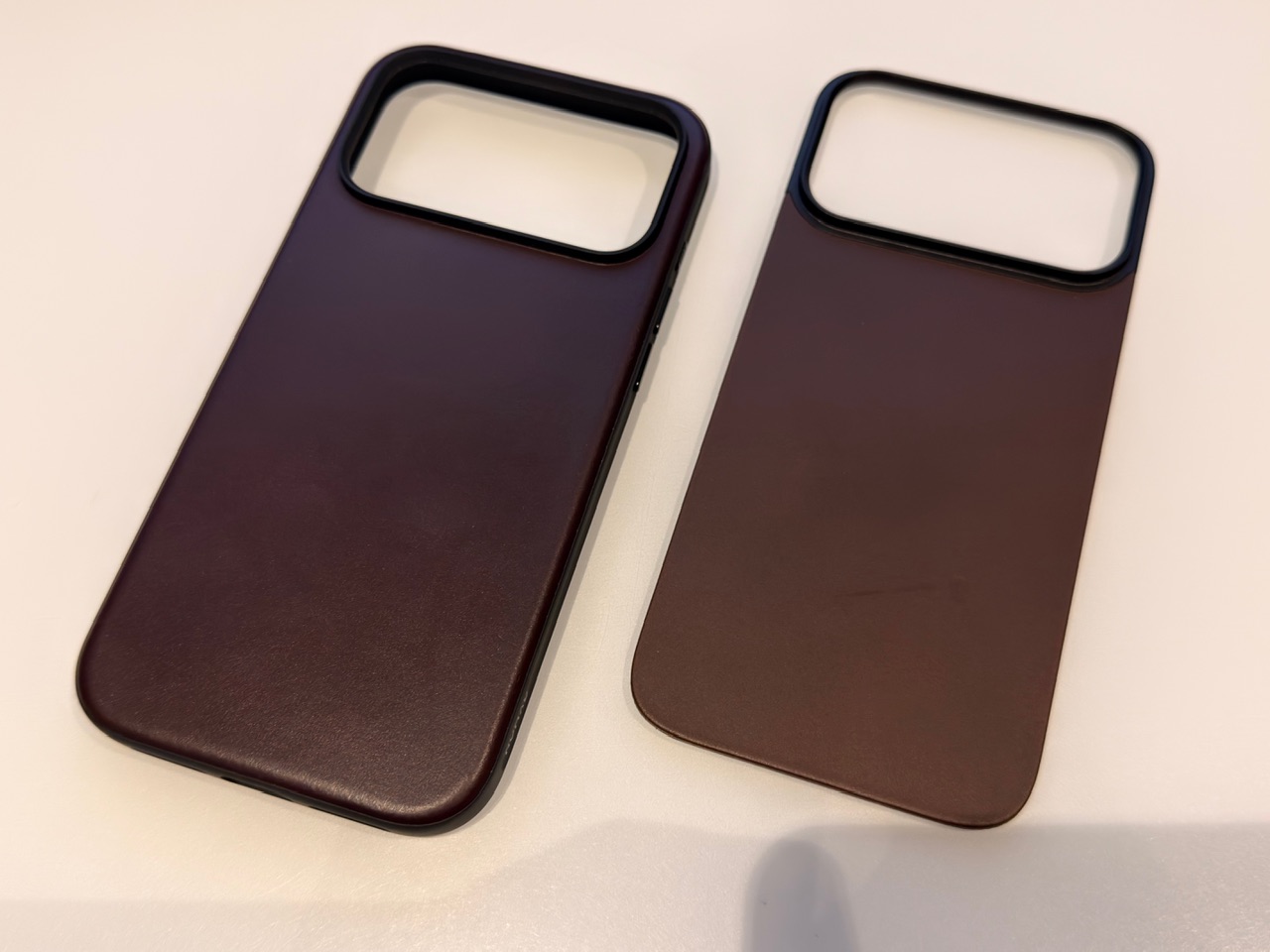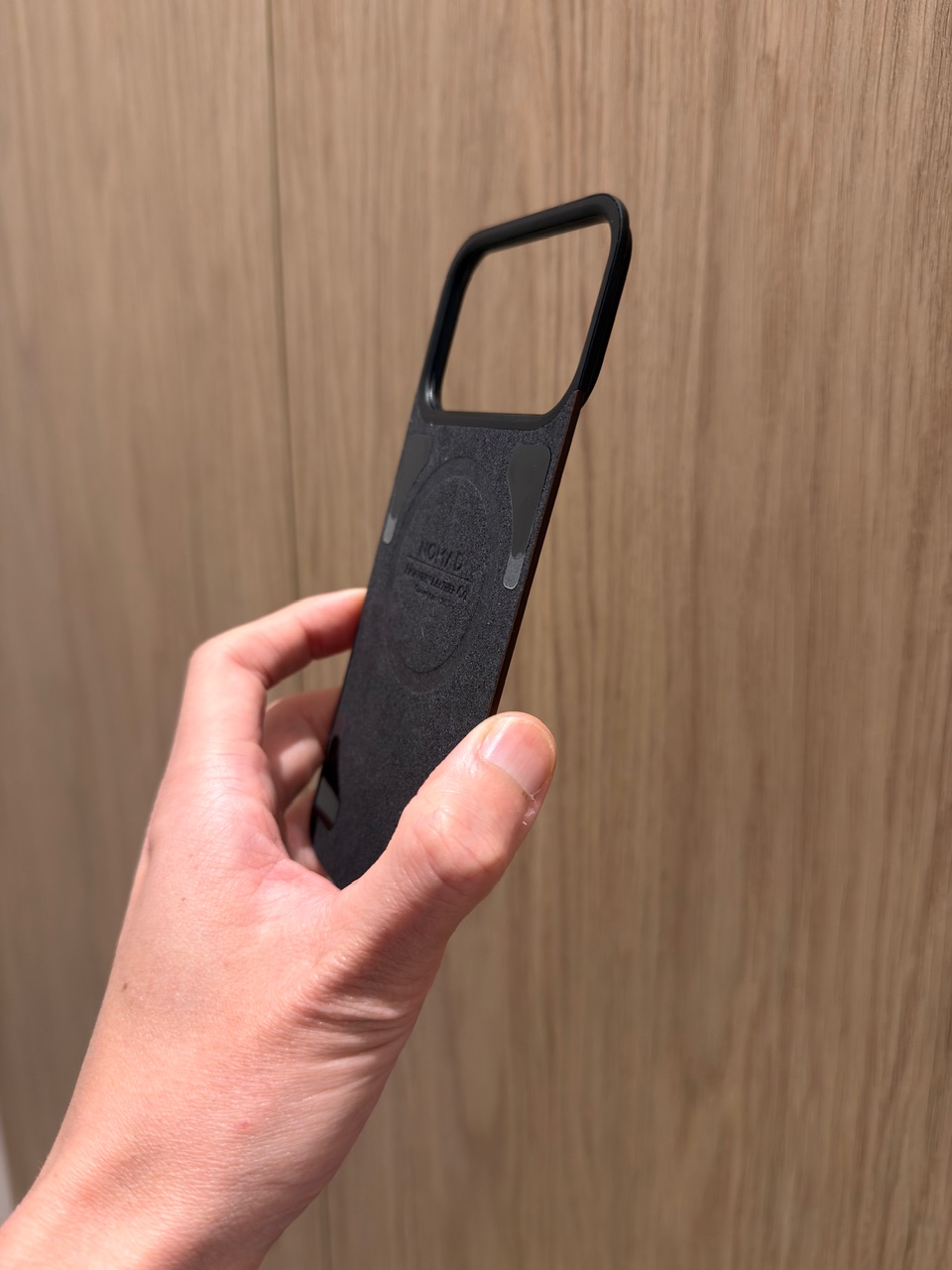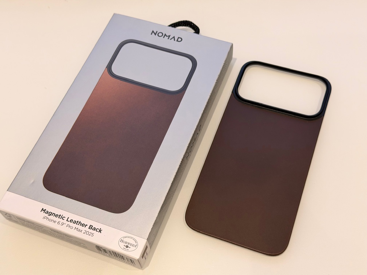 Nomad Horween brown magnetic leather back. Leather smells good and adds some grip. But offers zero protection.