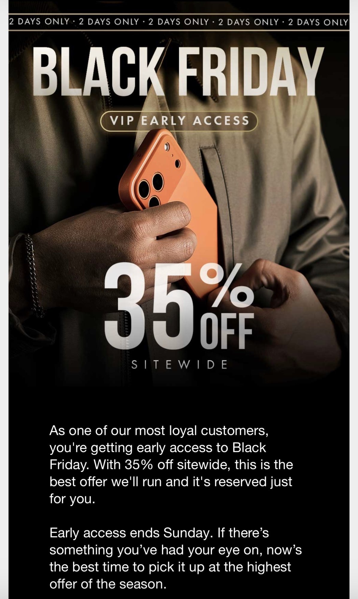 the code is THANKSVIP35No VIP email for mewill there be a Black Friday sale?