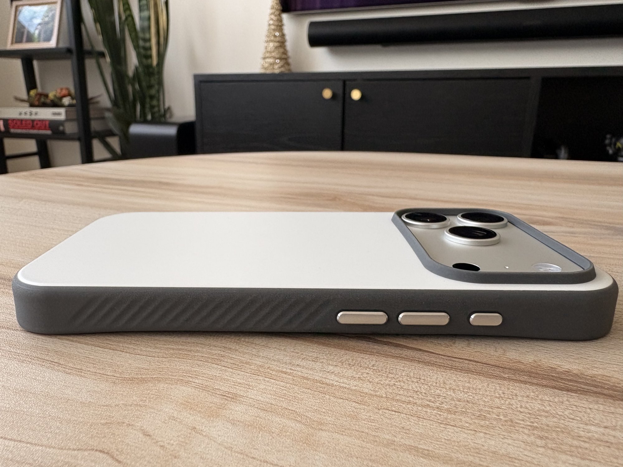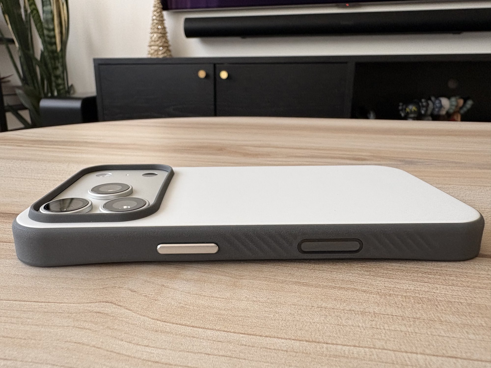 Initial impressions for the Moonstone, getting the case on felt tighter than the sheath and synthesis. The TPU frame looks lighter in person than the website renders, the colour is the same as the gray sheath. The back of the case has a smooth, sort of light textured sheen that doesn’t leave any fingerprints. The Moonstone reminds me of the Nomad Modern case in Lunar Gray but with better grip.