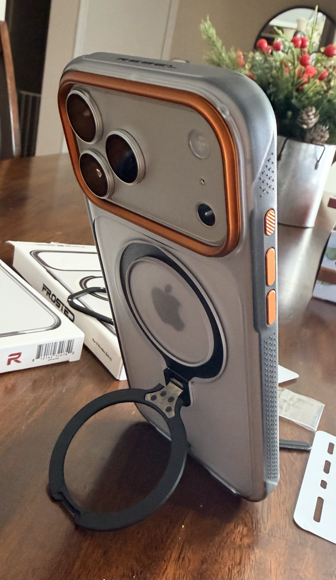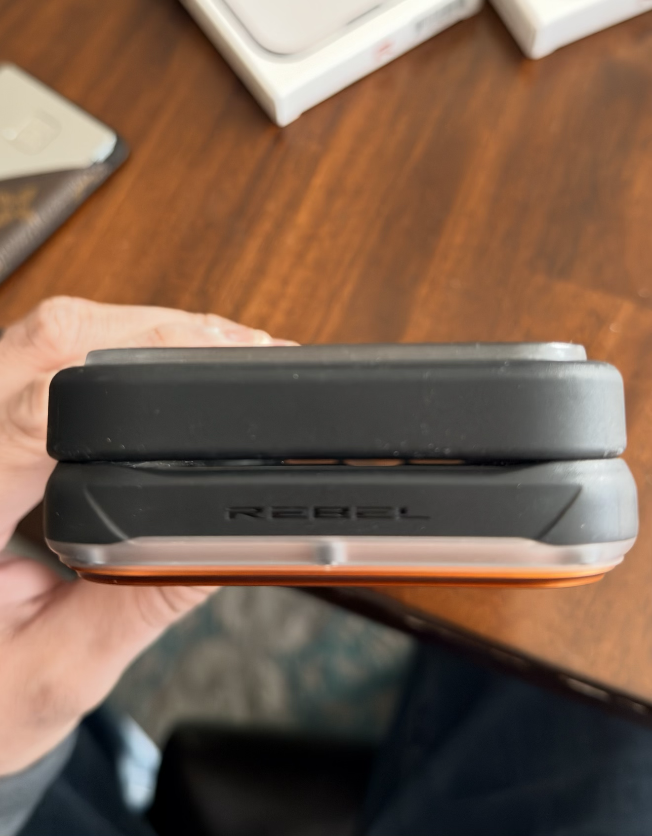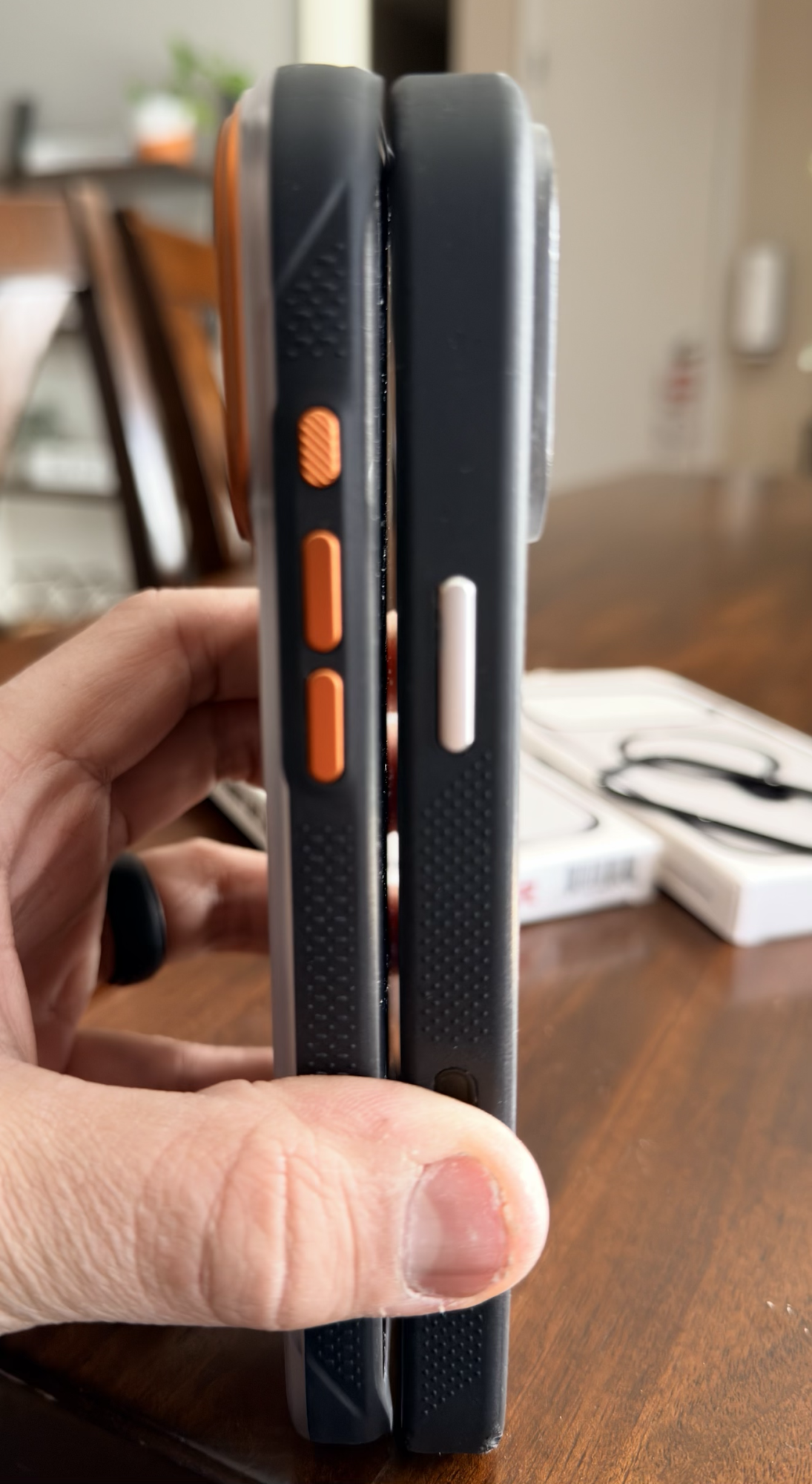 Feels nice and slim in hand. The top is tight , unlike the regular gen 7 where it’s a little loose. This thing takes some force to put on. This one’s my wife’s, gave her the orange accents and did silver accents on mine (minus the camera bezel since they don’t have silver yet). All in all so far I like it. Same as previous years where the case feels slightly wider than then the regular gen 7 due to different material but it is more grippy than last years. Wife was rocking a caudabe synthesis and her first impressions were “woah it’s orange” and “it feels like a new phone”. Included a couple pictures with a synthesis comparison.