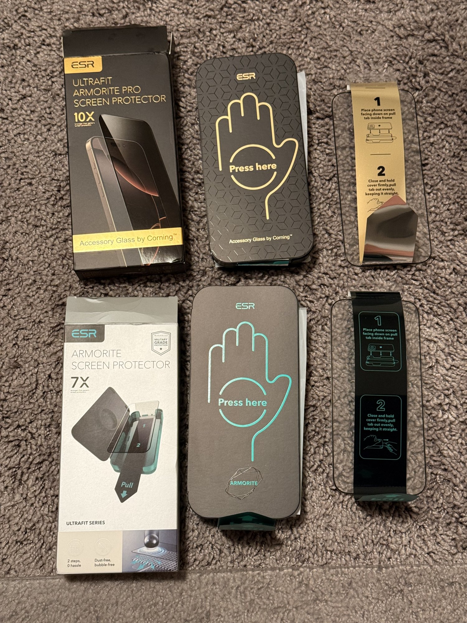 As a comparison between the two in terms of thickness and edges, what can you tell us? Which one is thinner and which has more rounded edges?Got the ESR Accessory Glass by Corning. All the screen protectors I got have a film on both the front and glass so can't get a good feel for any differences but it appears identical to the ESR Armorite in size and black bordering.