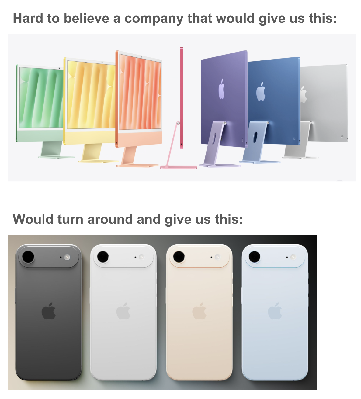 They’re a year late on Brat green. Really hope they go bolder with some of the color options and lean into maximalism a bit, I really miss 2000s Apple’s palette