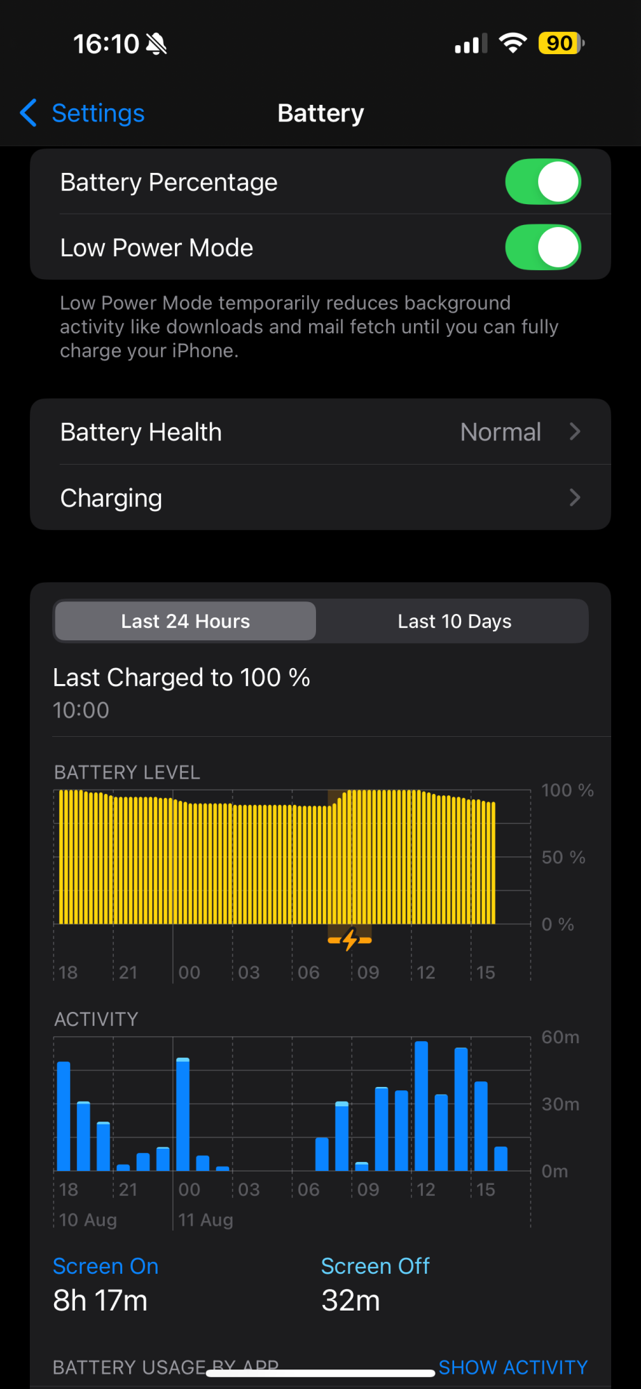 Me too.I can easily get two full days without charging my 16 Pro. Three if I watch my usage.
