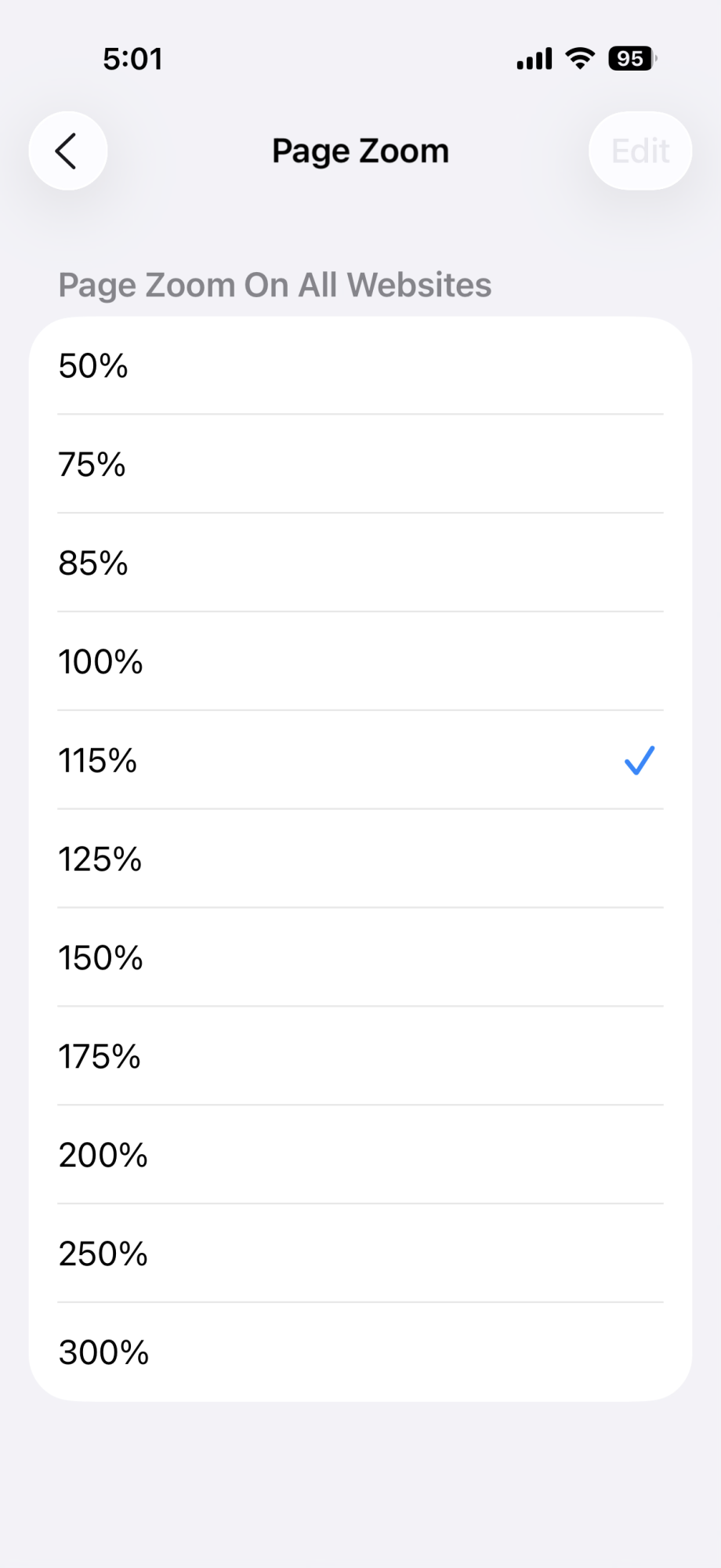That covers iOS text and most Apple apps like Messages and Mail, but not Safari. So for Safari I increased the Page Zoom to 115%.