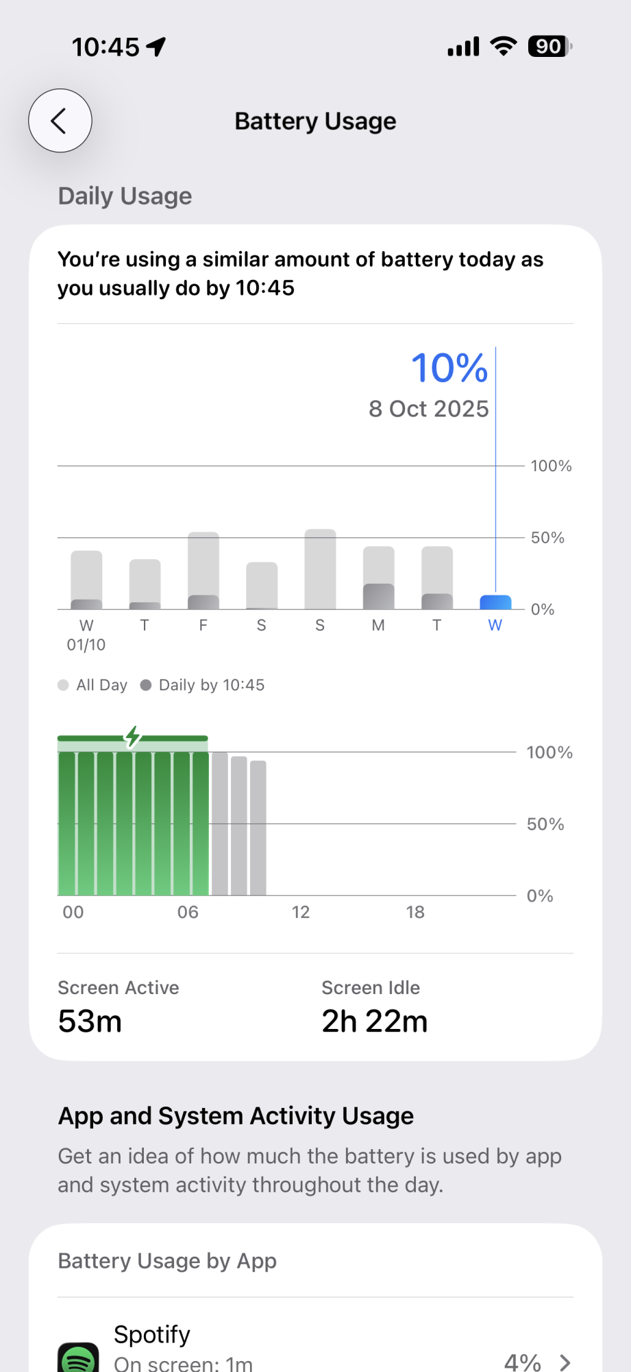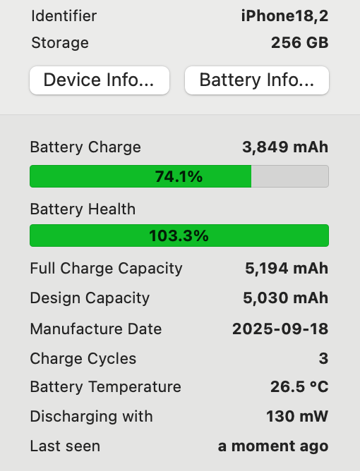 However, if I'm being honest, I don't feel as blown away by the battery life as I thought I would. I'm coming from a 3 year old 14 Pro Max with 85% battery health, and it used to get me about a day and a half, ending most days with around 50% from a full charge. The 17 Pro Max is a definite improvement, but I kinda feel like it's not that different than my 14 PM was when its battery was new, even though by every metric a new 17 PM should blow away a new 14 PM in battery life.