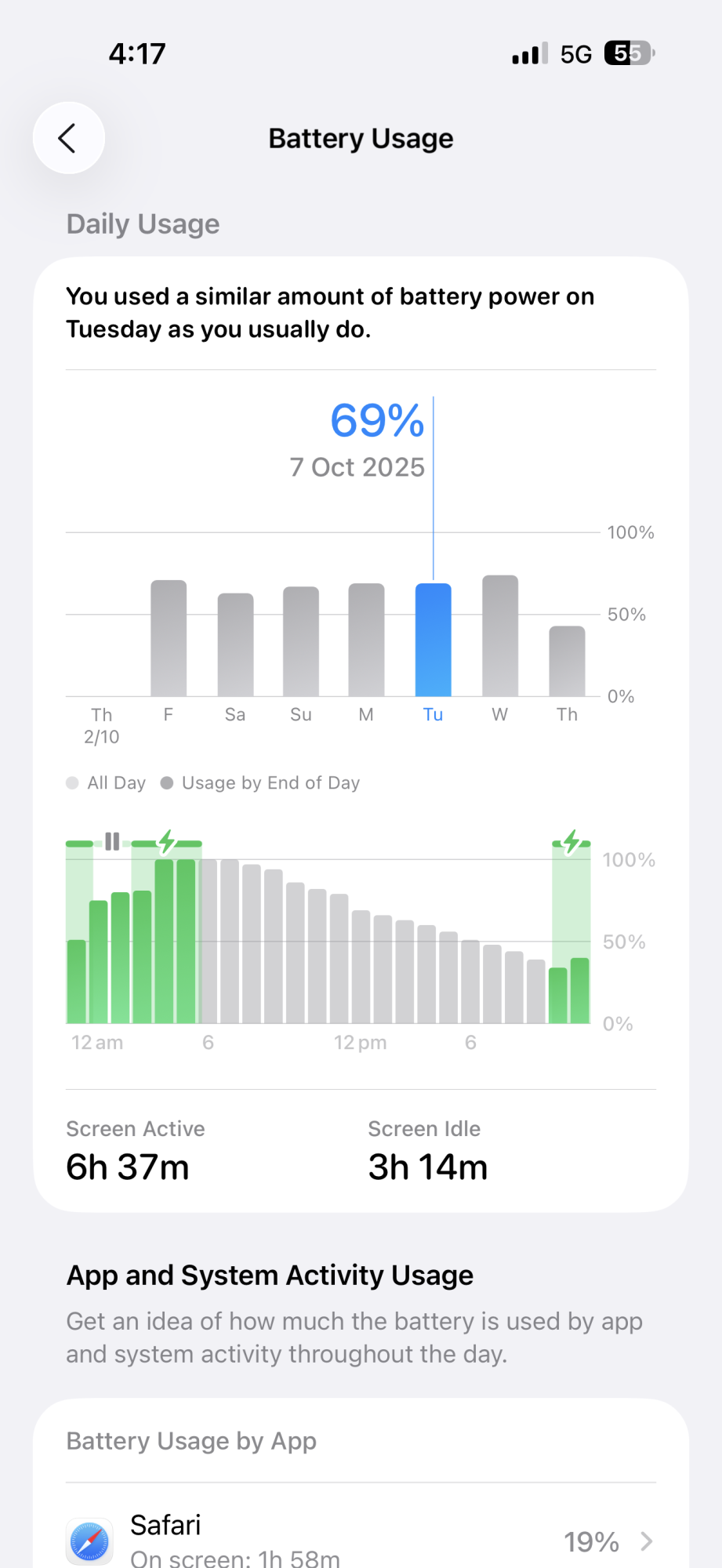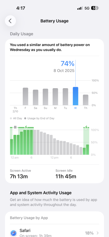 Your screen idle-time seems very high.Not impressed with the battery on my 17 PM (nano sim version).