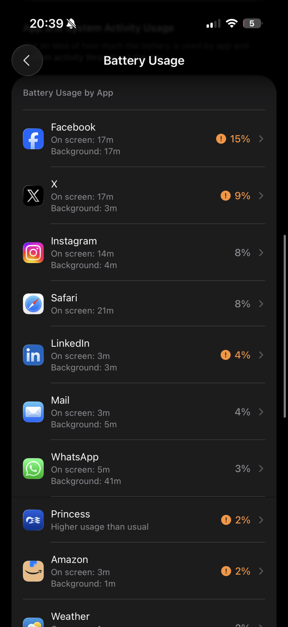 An hour or two is streaming Apple Music on 5G. The individual background time for each app don’t add up to the total so not sure what’s going on.Your screen idle-time seems very high.