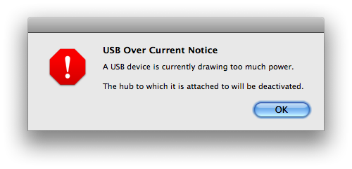 "USB Over Current Notice: A USB device is currently drawing too much power. The hub to which it is attached to will be deactivated"