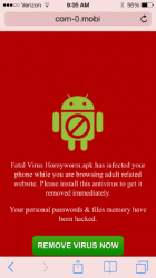 My sister-in-law has an iPhone 5 and when she opened up Safari this morning to go to the Internet she received a pop-up labeled com-0.mobi along with a message "Fatal Virus Hornyworm.apk has infected your phone... (see attached image).