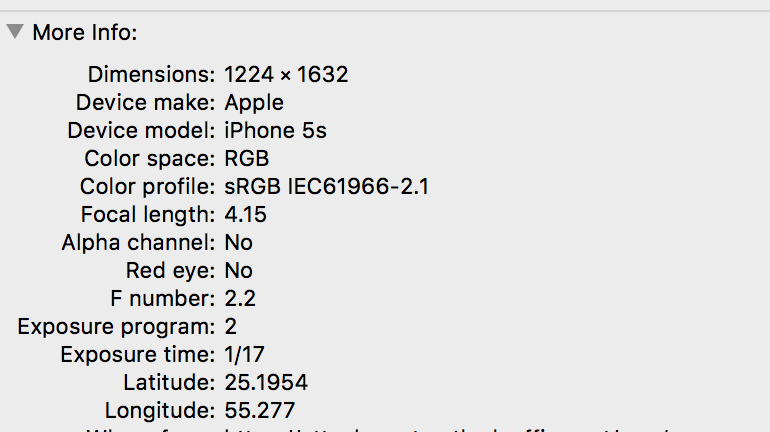 I suspect my computer is too old. My OS is 10.9.5. I went to "Get Info" but GPS was not one of the options. Sigh.Yep. just goto "get info" on the files and you'll see the GPS data.