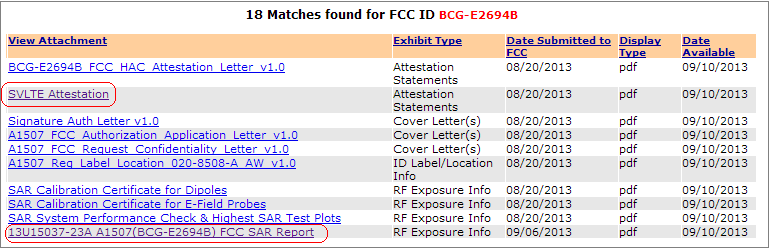 Click on "Detail" and you'll get a list of documents. In this case, including the SVLTE letter and my favorite, the SAR report which lists the frequencies and sometimes the antenna locations.