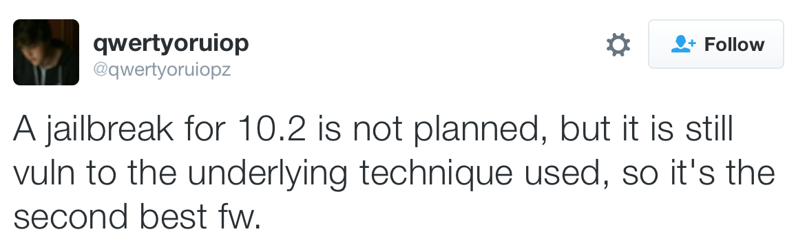 I take it to mean that the exploit(s) currently making the 10.1.1 jailbreak possible, have not been patched by apple on 10.2. Meaning that a 10.2 jailbreak is technically possible, but as of now, unplanned.