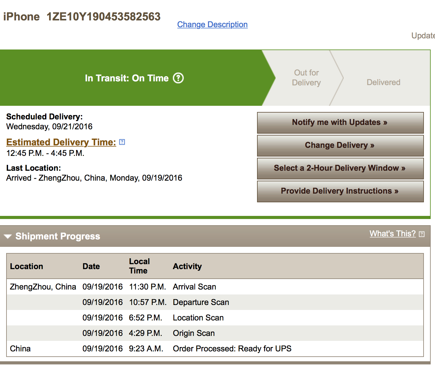 The only flight leaving ZhengZhou within a minute of 2 was this one going to Shanghai... http://flightaware.com/live/flight/CSH9330/history/20160920/0920Z/ZHCC/ZSSS Except that it is Shanghai airlines. Wouldn't UPS just use it's own plane, or is that not until it departs the country? The Shanghai destination is the only one I've seen phones go to that I recognize on the departures list from ZhengZhou. No UPS flights listed though...Yep I just got a 5:25 departure scan with no delivery date still. Can anyone tell us which flight it is on from this info. please.