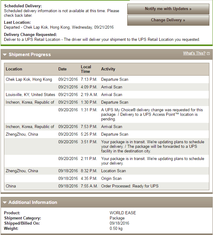 Their systems are probably overloaded with 1000's of calls asking why there is no scan info between China and KY.I'm still trying to understand how there's no scan info between China and KY!!! I worked for UPS IT 20 years ago, and recall it being a TIGHTER SHIP than what it is now... Hell, I don't think they used that slogan anymore, now I can see why!!![]()