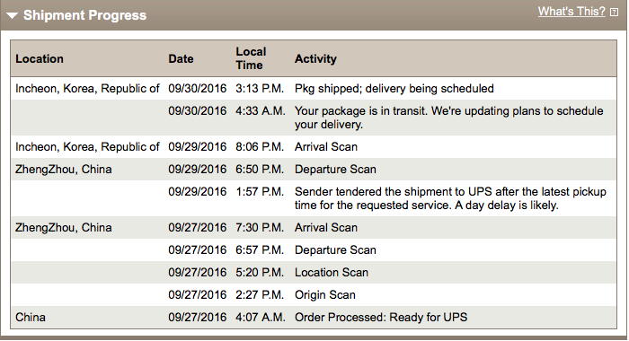 When was your shipped from China? Mine looks like it is hung up in Korea. Mine departed from ZhengZhou, China on 9/28/2016 11:57 P.M.