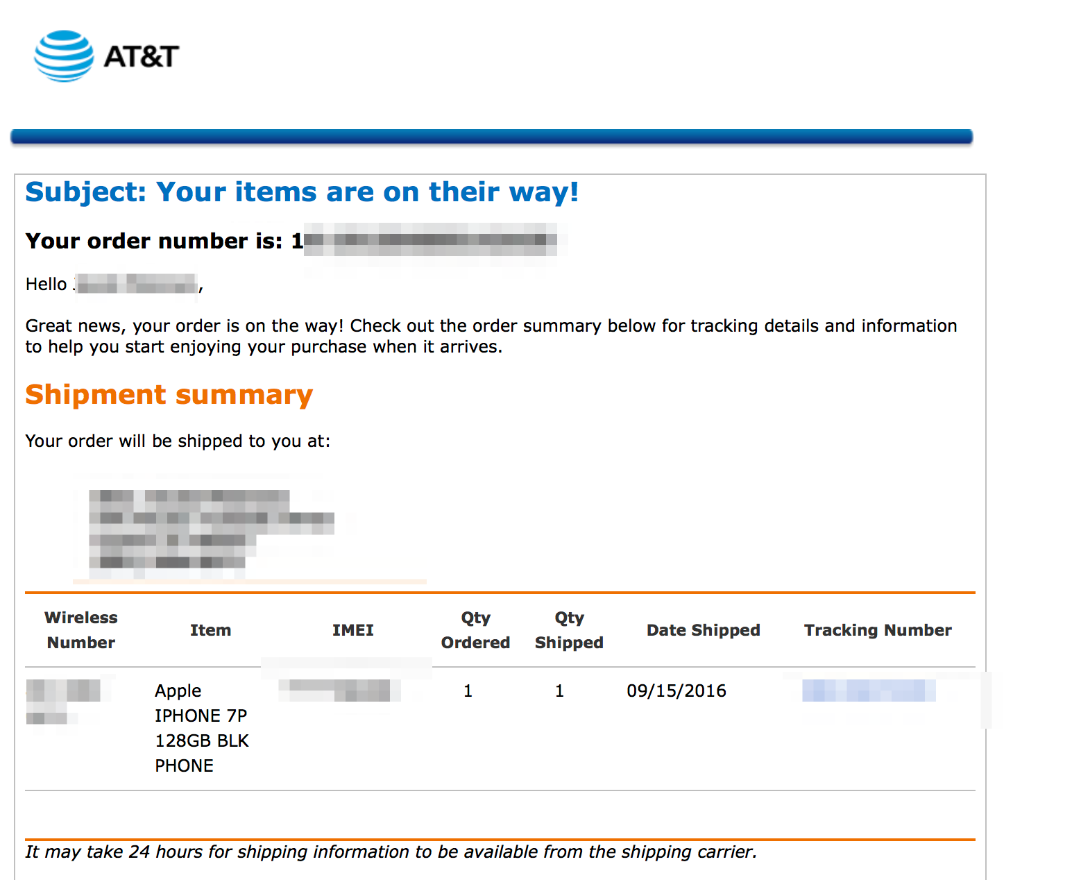 I too have an order time of 2:58 EST. Same date window. I really don't get how people that ordered hours, even days later got the same dates and have received shipping data. Don't get this whole ATT system. It seems so arbitrary.You're the first person I've seen on here that ordered the 7P Gold 256GB. I was starting to think no one ordered that color but yet it hasn't shipped.