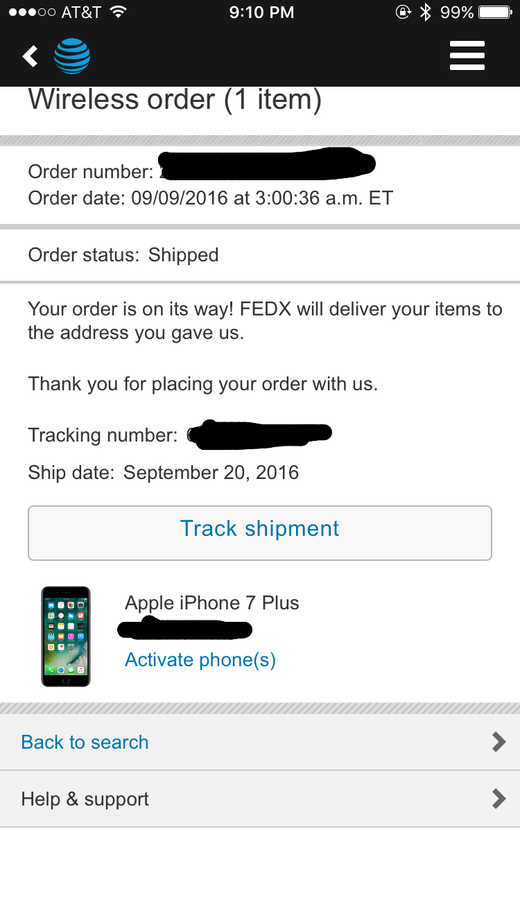 Finally someone else in Louisville. I said something similar a while back, but I think they come in big boxes to UPS and then they take them to Dallas to AT&T and then we get them. It would be nice to just show up at UPS and snatch my phone out to avoid this mess.Just got home from work and checked, my 7plus matte black 128gb was ordered at 3:20am on 9/9 and was scheduled for delivery 9/23-9/30, now showing shipped with delivery tomorrow.