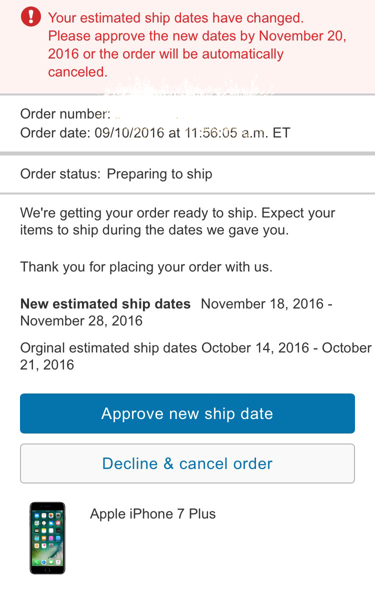I got my iPhone 7 Plus 128GB Matte Black model today (well yesterday it's after midnight). I ordered on 9/9 @ around 12:30PM Mountain Time. It went to back order on Friday 9/23, and shipped on Saturday 9/24, and arrived on Monday 9/26 at about 12:30PM Mountain Time.