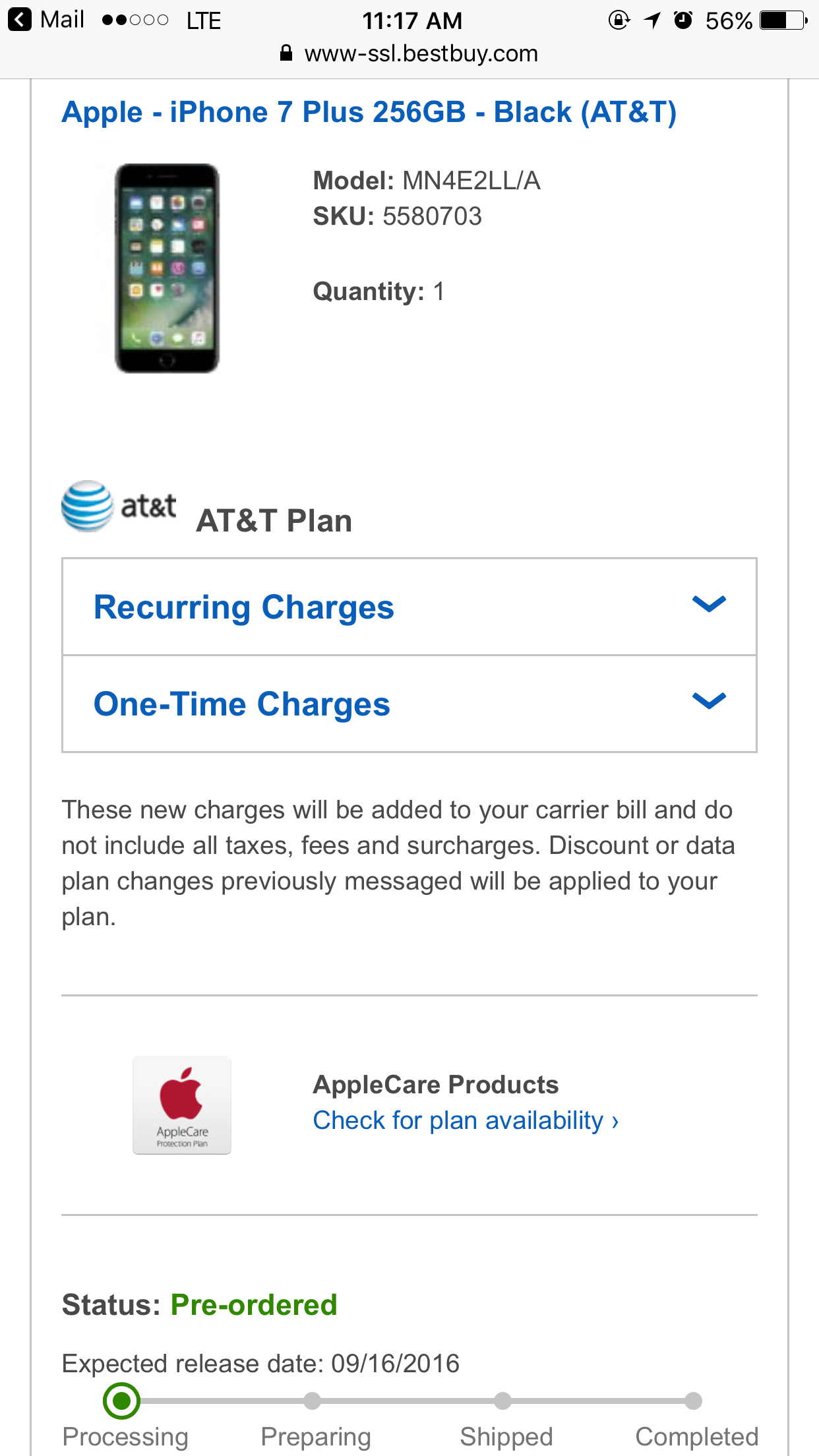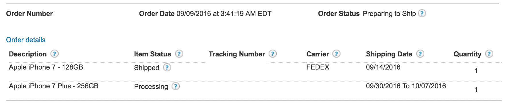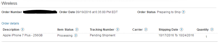 Order date 9/16, iPhone 7 Plus JB 256gb Shipping dates Nov 28-Dec 5What is your order date, model, etc.