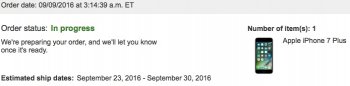 Also what's crazy is some people ordered their 7+'s a few minutes earlier than mine, and others, and we got a week later ship date. I hope it's just them saving themselves in case they did have 16th and couldn't deliver on that date.