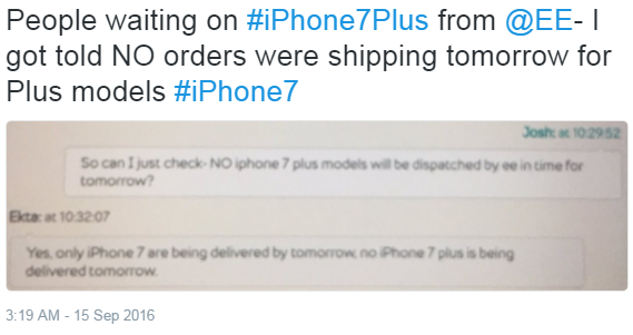 Wow, so, again... Massive win to their CS team. I know it's not their fault that inventory isn't great, but seriously, don't overpromise – especially on a launch dayI just spoke to EE. Ordered iPhone 7+ jet black 256Gb at 08:13 last Friday. Was told definitely available launch day.