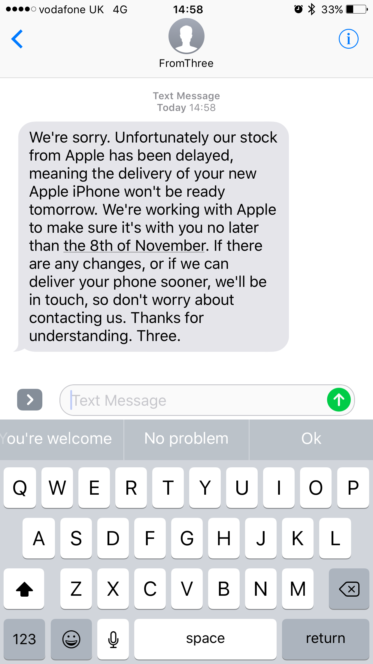 Update - I received a DPD text last night to say my phone would be delivered on Monday (24 Oct). Then this morning I received another to say the phone would be delivered today (22 Oct), then received my new phone about an hour later! Very happy Three exceeded their estimate by delivering almost 2 weeks early!