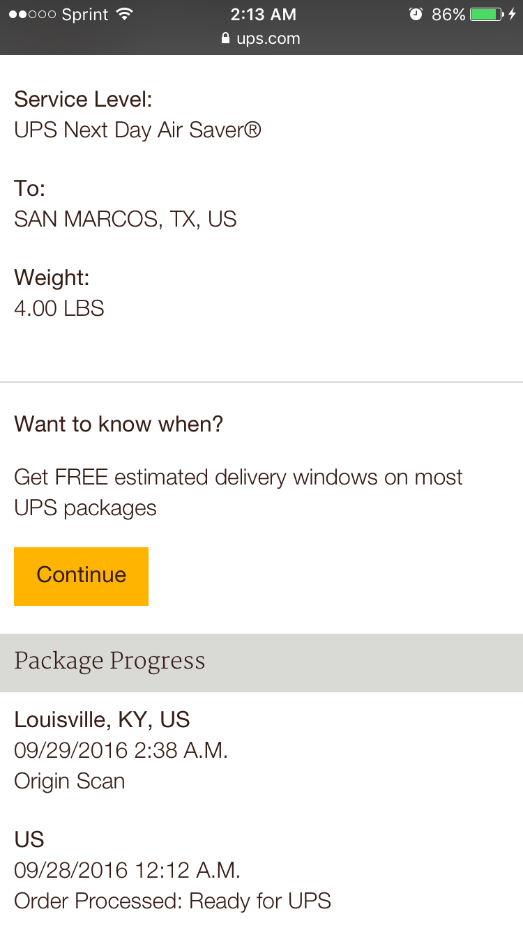 I believe a package doesn't exists for me. For the life me I can't understand someone at Sprint not saying I should have it the next business day if it's shipped next day air or at least be at my local UPS facility next business day.
