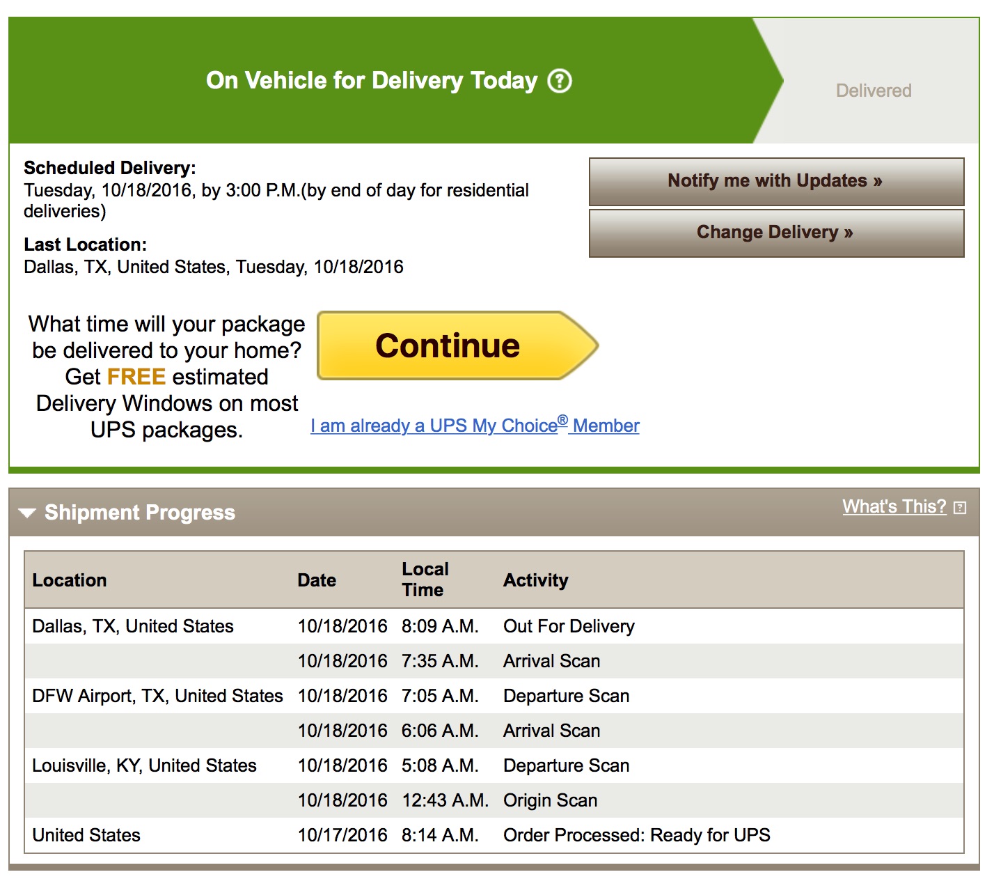 The tracking number was issued Sunday night at 7PM. Tracking number went "live" at 8AM yesterday morning. It sat at "Processed, Ready for UPS" until 11:45 last night. It then started updating.