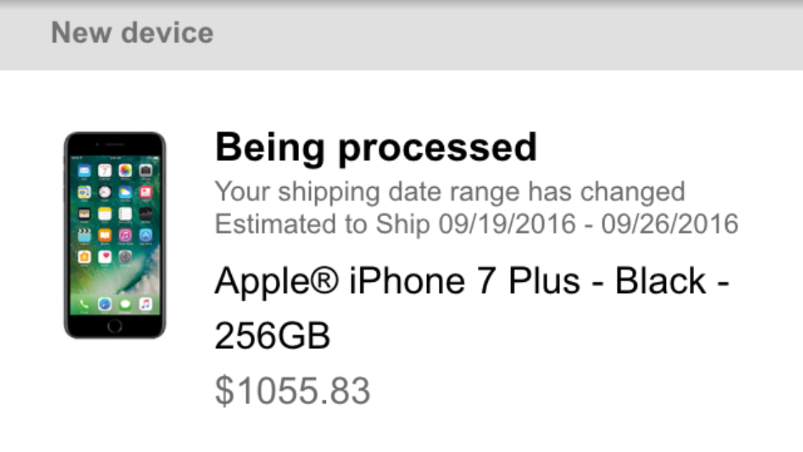 Totally agree I don't see the whole purpose of preordering if it's I'm receiving months later but I'm just hoping by tomorrow we will see changes . Learning how to be patientI tried to cancel it and they said since I used Jump I couldn't process a new order until the 19th. Last time I will go through T-Mobile for anything. Next year I'm doing this through Apple.