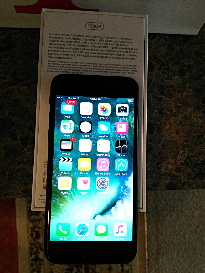 Here's my story: Went to the first T-Mobile store this morning and they let me in at 7:45 only to say they didn't get any iPhone 7s in for today. Drove quickly over to the Mall and saw a T-Mobile rep at the food court and he said they got 3 regular iPhone 7s in and there was one left. He went with me to the store. He went to the back and got the matte black 128gb and then tried to up-sell me to an iwatch and ipad pro. I said no and then he says these phones are reserved for new customers. That was an unbelievable! I told him that I've been a customer for over 10 years and he was going to sell me that phone. With no expression at all he continued to ring up the sale. Photos attached. Note. the photos of the phone wasn't taken with an iphone. I've started to play with the camera and the photos seem really good so far. I'm coming from an Note7 that I just had to turn in.