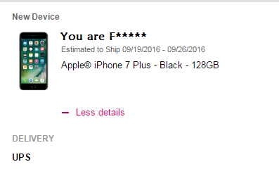 Nope. On either MyUPS or T-Mobile and CC charge. Original dates were 9/27-10/10 for the 7+ black and 11/1-11/30 for the 7 jet black.And it showed nothing on your online account and no CC charge? What was your original shipping estimate?