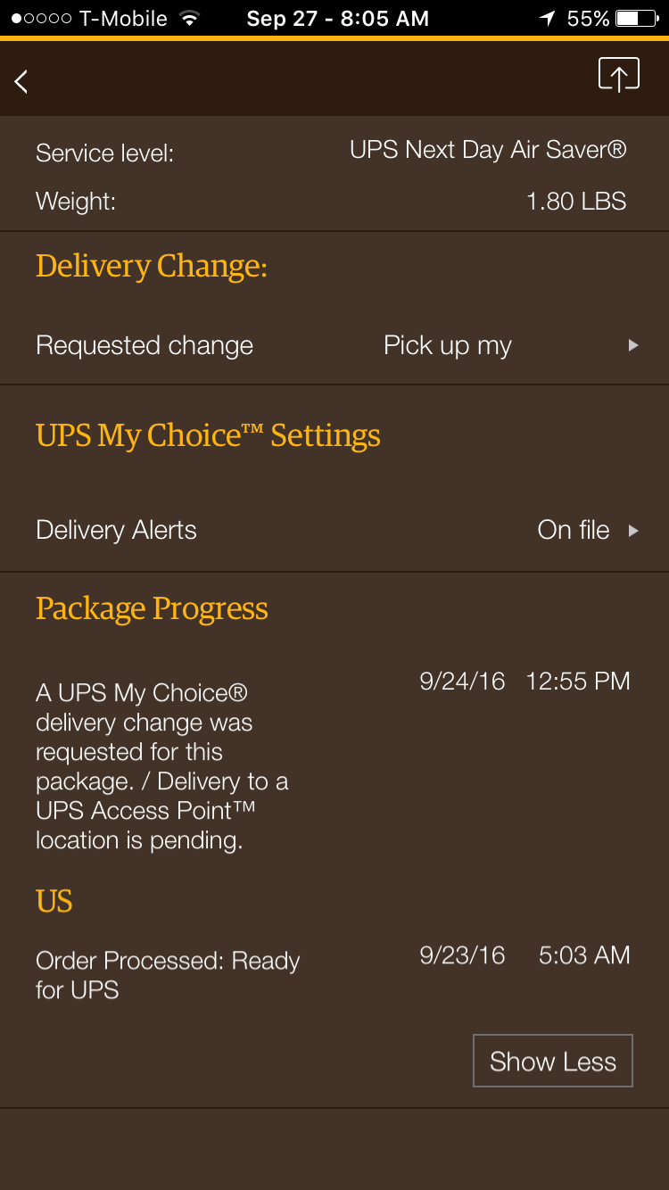I got shipping emails from T-Mobile and also trade-in emails. My status is now marked as shipped too. But MyUPS still says ready for UPS. No origin scan yet. However, looking at some of your screenshots, I see that we all were charged the same day at exact same time (batch update of course). So that makes me think that we all should be in the same batch for shipping too. But since I am on the West coast, our origin scans might happen at different times that yours and perhaps even later.