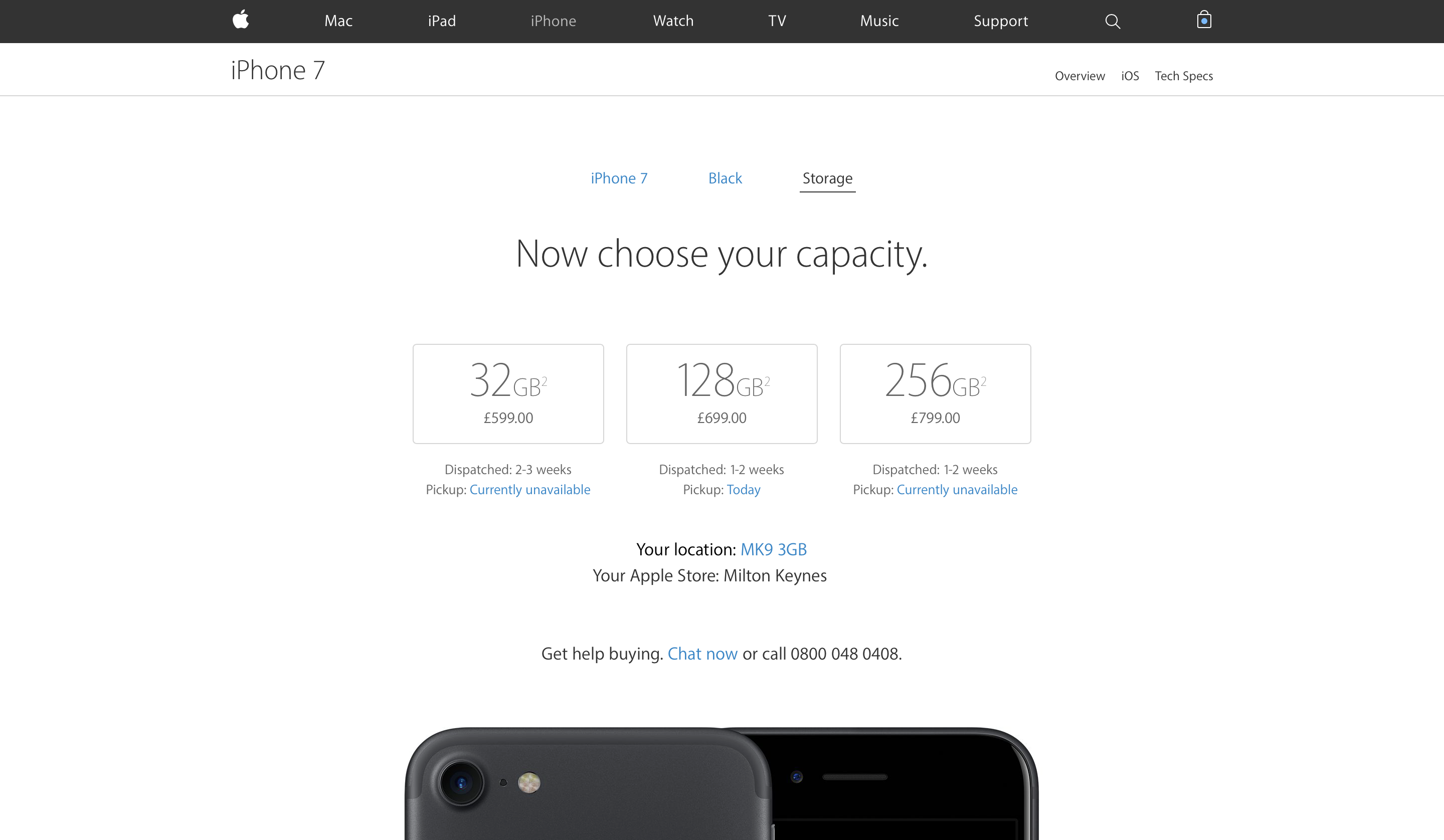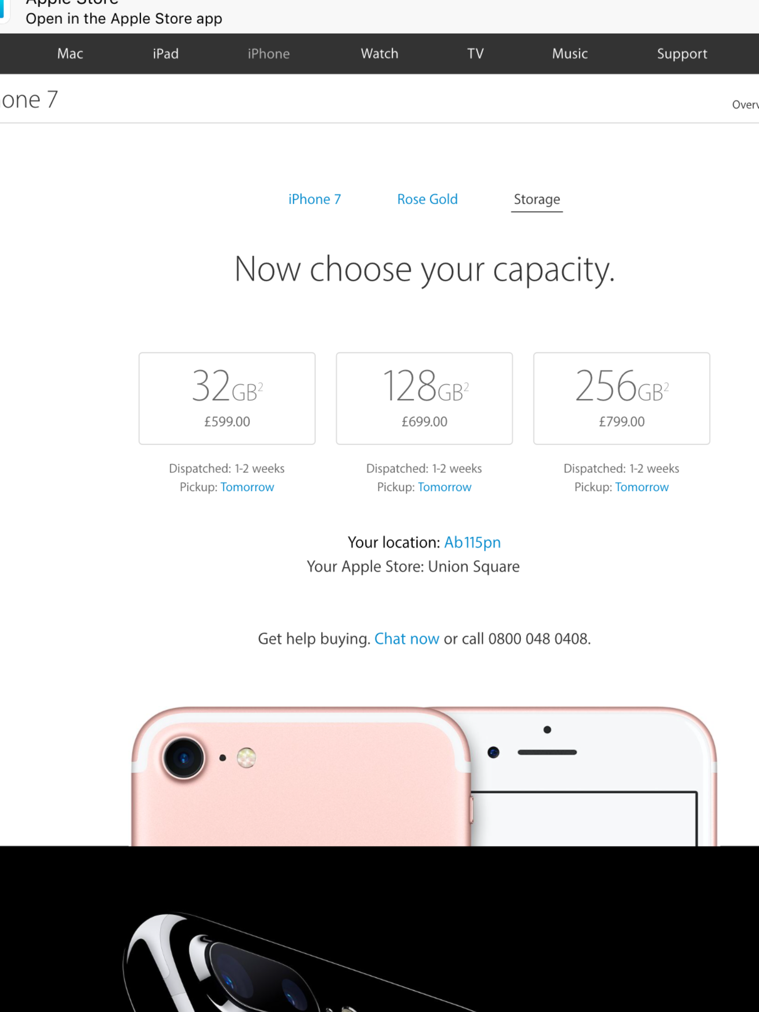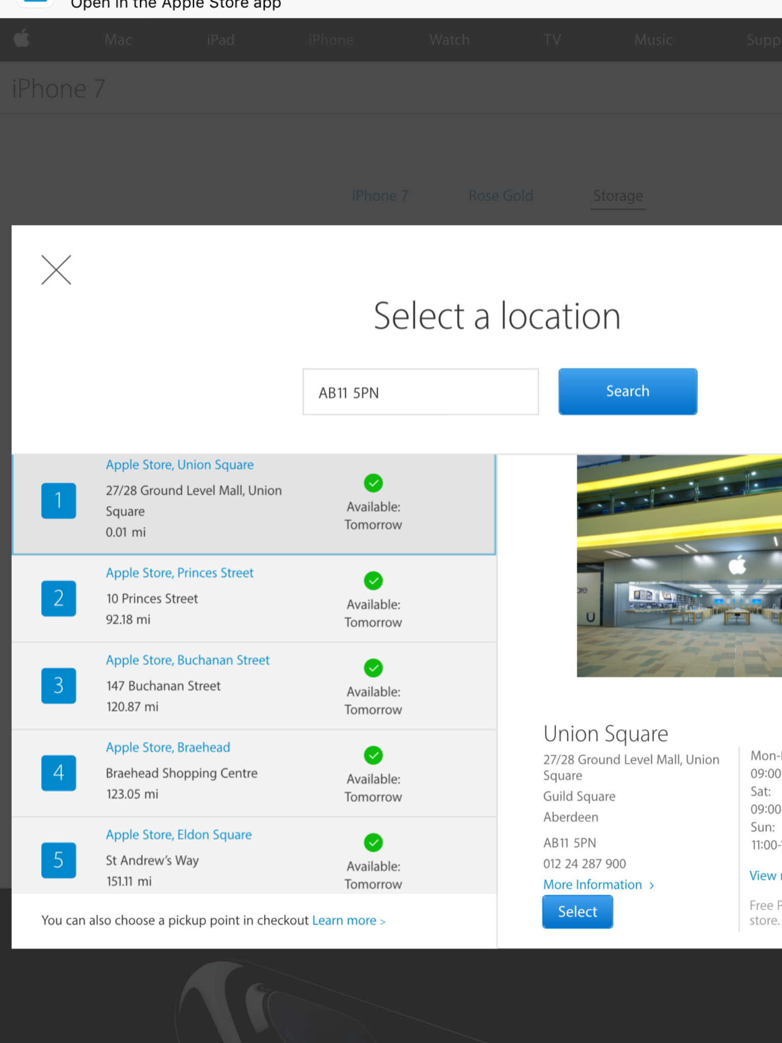 Just go on the Apple website and select your chosen iPhone 7, at the end after selecting the colour and storage you will be presented with the first screenshot, when you click into the 'tomorrow' blue highlighted link it gives you the second screenshot, all the available stores your selected iPhone is ready to be picked up from