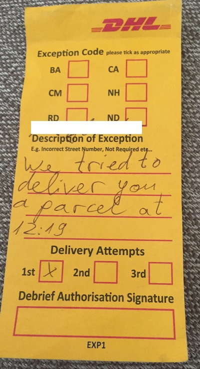 Anyway - cut a long story short I got hold of this local-rate DHL Express number 01332 816960* and spoke to a very helpful lady who was able to find my reference number by postcode and arranged for delivery tomorrow to a local shop half a mile away. I now also know my tracking number... happy days!