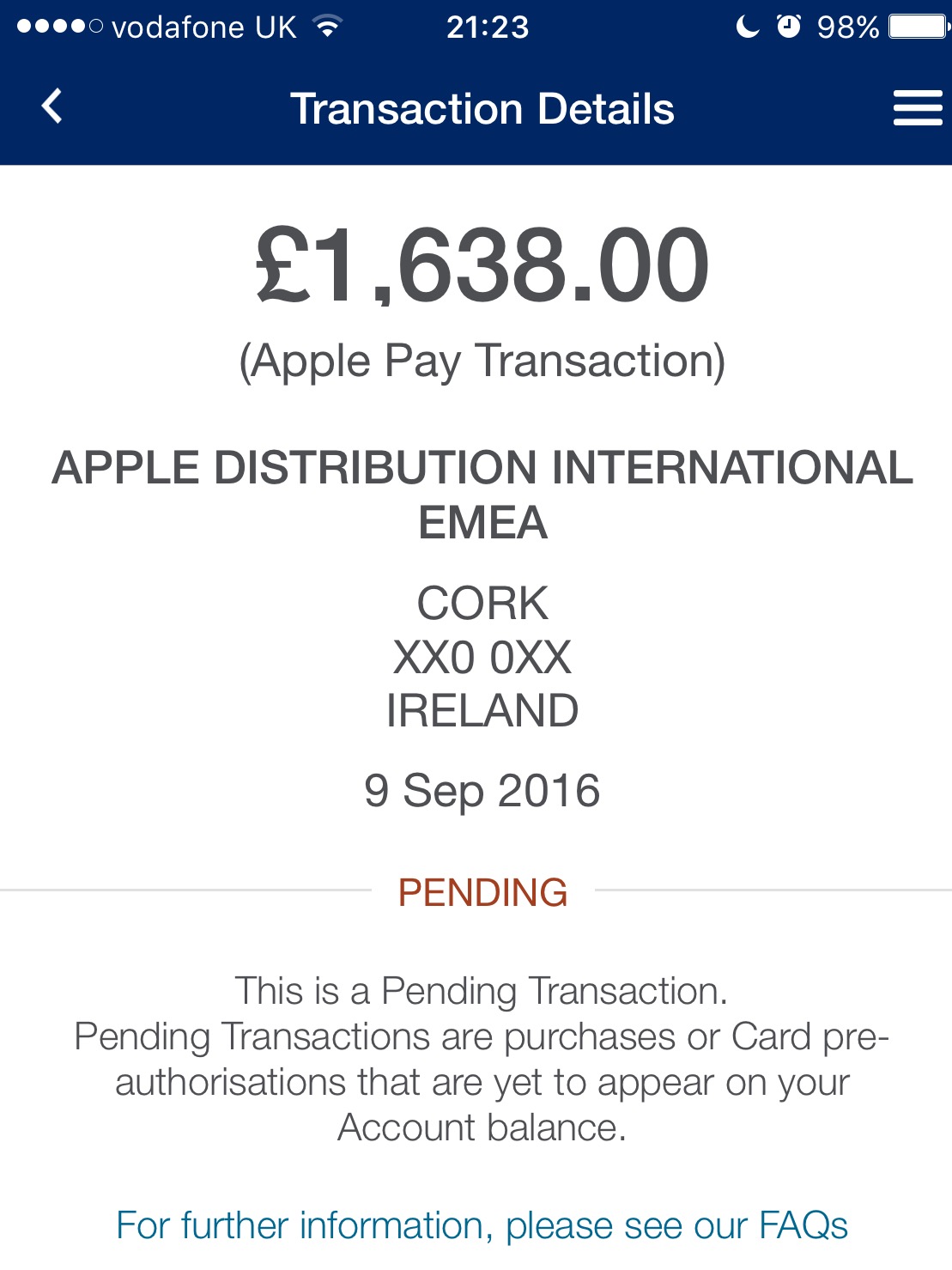 Has yours gone to preparing for shipping?The credit card is Bank of Scotland but it's the same crew of idiots. It took over 30 minutes to get through to their fraud team who apparently were getting more calls than they were expecting. They also had to apologise for not contacting me to advise of the block on my card. It's all fixed now though and after a quick call to Apple my order is going nicely!![]()