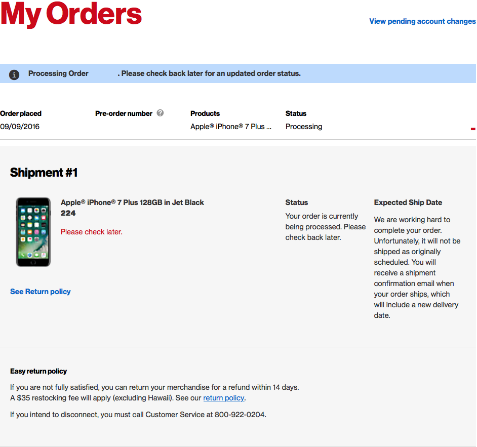 [Verizon] "We're sorry but we have no more Jet Black iPhone 7 Plus's in inventory and we gave your phone to someone that ordered 8 hours later than you......" WHATTT???Yes this is what mine says also! I am not happy at all!
