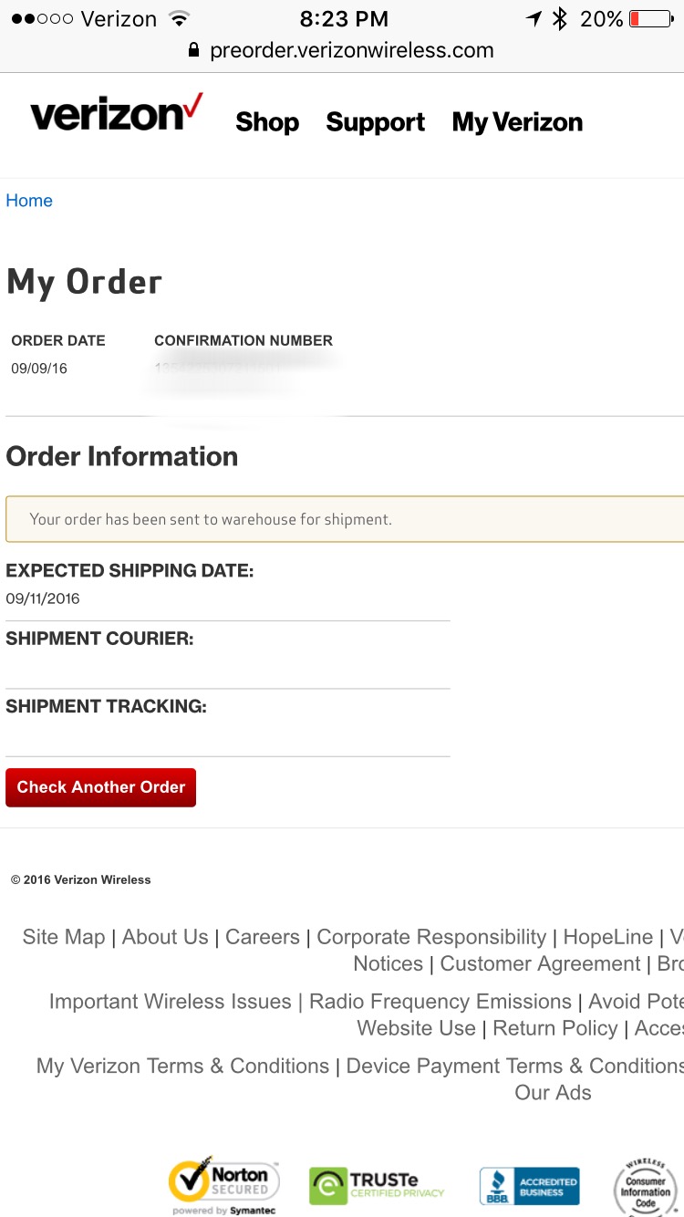 Mine just shows my payment method and says my order is processing.If you check your order status from https://preorder.verizonwireless.com/order/common/searchOrder.jsp you may get more shipping info... This is for a matte black 7 ordered around 11:30EST.