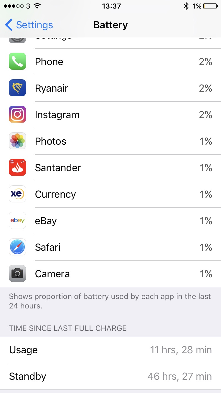 That's great but you do realize the usage time isn't all screen on time right?iPhone 7 (4.7) had about 2 weeks, drained battery completely a couple of times out of the box as I always do. Brightness at approx 50%, fetch mail off, location services limited to a handful of apps, Low Power Mode on at 20% remaining. Probably around 50 % of time on variable 3G signal and 50% wifi.