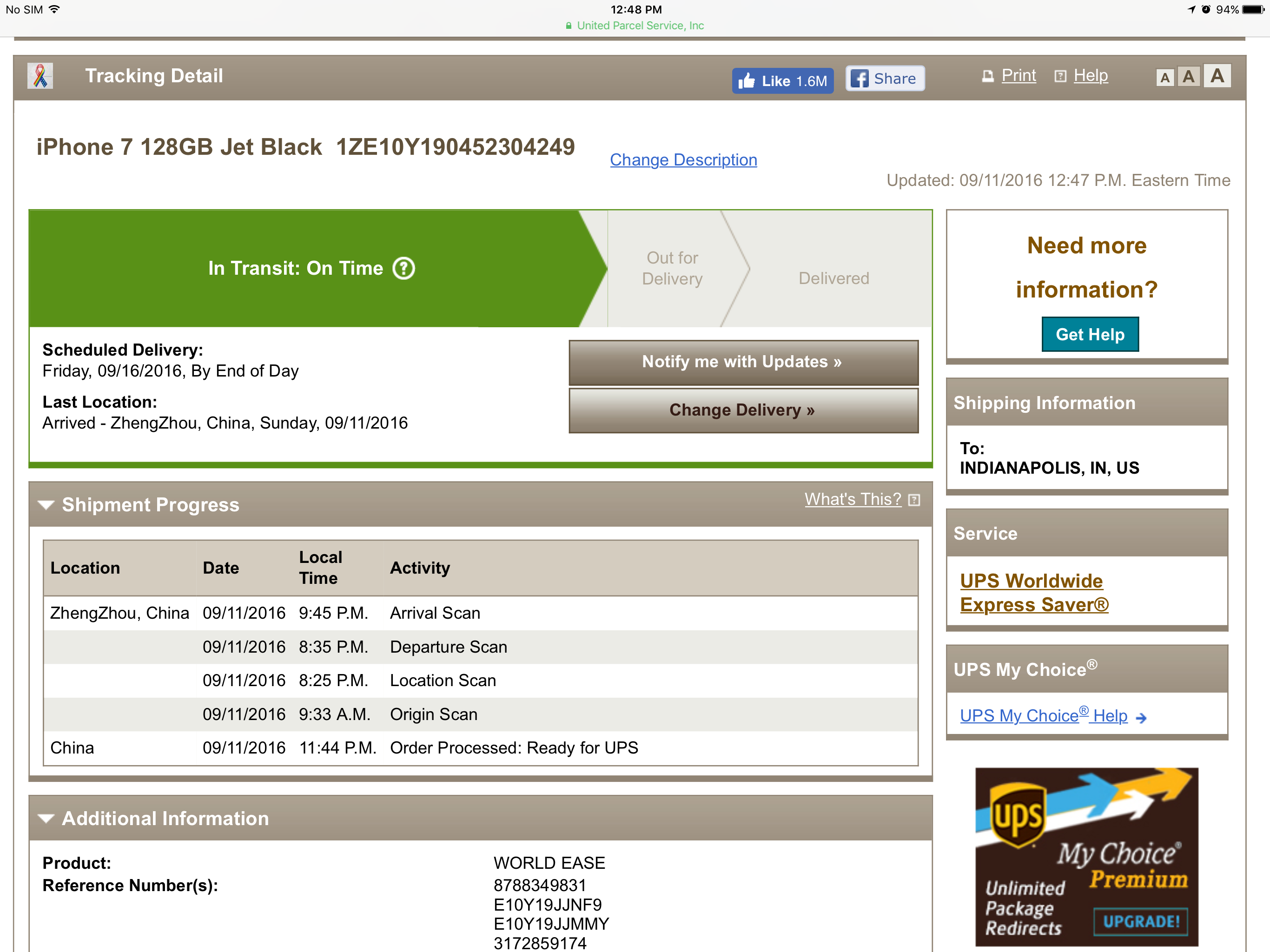 I ordered a 7 in Jet Black, 128GB. It wasn't showing a shipped status or tracking number in my Apple order...However, it is showing up in my UPS My Choice profile with the same origin at Zhengzhou China, with a delivery of 16 Sep. I was even able to change delivery to hold at the UPS facility cause I'm never home when "Brown" comes by. Don't want there to be any issues in picking this bad boy up!